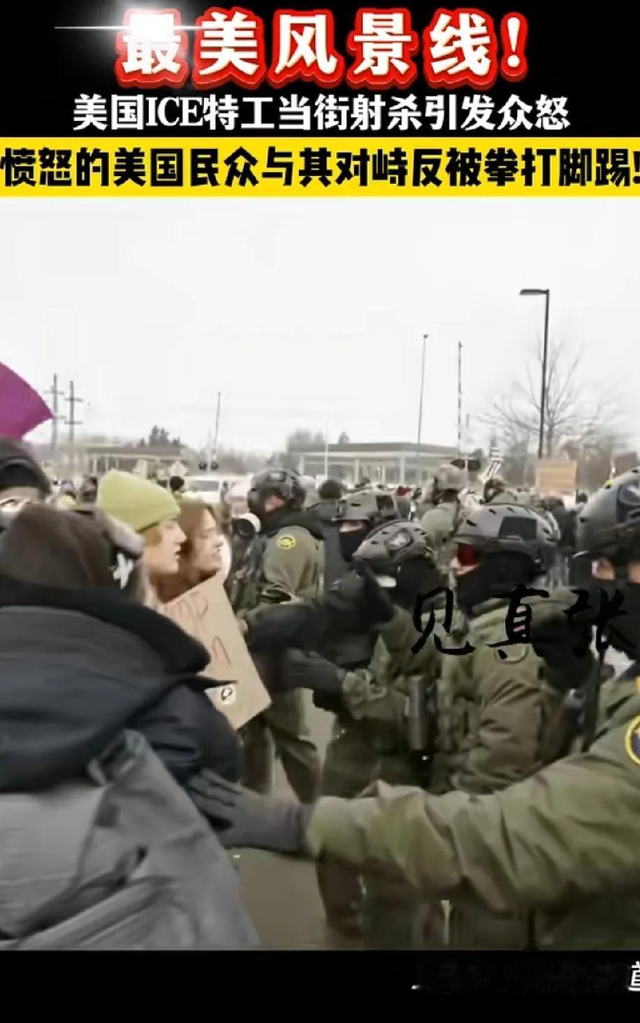 美国再现最美风景线! 就在昨天,美国移民与海关执法局人员在明尼阿波利斯市执法时,开枪射杀了一名驾车路过的女子,这名女子名为蕾妮·古德,现年37岁,是一位土生土长的美国公民,也是一名已故美国军人的妻子,一位三个孩子的母亲,而是她还是刚刚送孩子上学归来的无辜女子! 这件事儿,在美国闹出来的动静远比马杜罗被美国强行从委内瑞拉越境抓捕来的轰动,马杜罗这位委内瑞拉的总统在美国的宣传中他是毒贩是危害美国的一份子,美国人没有那么多的同情心去关心别国总统,但这位女子则代表了美国现如今的本土民众切身利益遭到了最严重的伤害! 老实本分,一位信教爱家逼儿女的家庭主妇就这么被政府部门的人活活打死在了大街之上,最可气的是在女子受伤以后,有医生想要上前去救助这名女子也被执法人员拒绝! 呵呵,这就很美国了! 所谓的自由民主,被子弹打的稀碎!