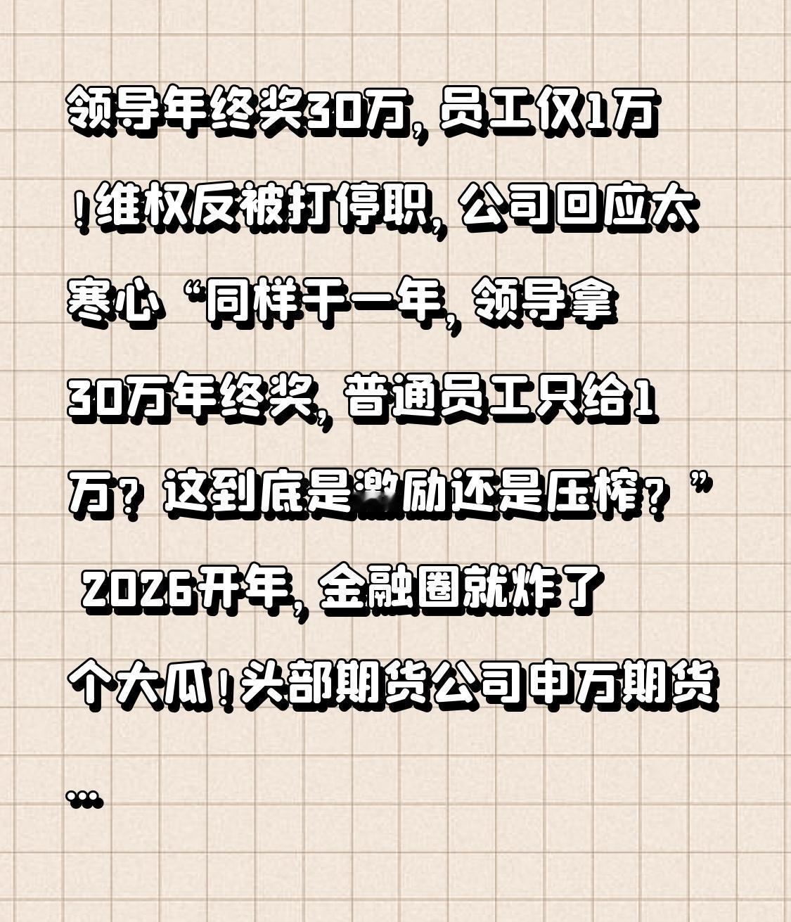 领导年终奖30万,员工仅1万!维权反被打停职,公司回应太寒心 “同样干一年,领导拿30万年终奖,普通员工只给1万?这到底是激励还是压榨?” 2026开年,金融圈就炸了个大瓜!头部期货公司申万期货的一则年终奖分配,直接让全网打工人破防。入职5年的老员工唐先生,盼了一年的年终奖到账仅11763元,可他无意间得知,一级部门领导的年终奖高达30万,30倍的差距让他和同事们彻底懵了。 更让人没法接受的是,这不是公司经营困难,反而赚得盆满钵满!公开数据显示,公司营收连续三年暴涨,2025年行业行情更是火热,成交额同比增长23.74%。可员工的收入却反着来:唐先生2023年还能拿5万年终奖,2024年直接停发,2025年缩水近八成,季度奖金也砍半,前台同事甚至有季度分文未发的情况。 带着满肚子委屈,唐先生在531人的公司工作群里发了条质疑,要求公开核算规则。可没等来解释,他的企业微信账号当天就被封了,紧接着被总经理叫去约谈。为了留证,唐先生开了直播,没想到直播中双方爆发冲突,他被推倒在地,脸部软组织挫伤、头部外伤,诊断为轻微伤。 这还不算完,节后第一天他就收到了《停职检查通知书》,理由是“发表不当信息、不服从工作分配”。再次去公司沟通时,又被保安推倒导致手腕挫伤,两次受伤他都报了警,警方已立案。而公司给出的回应更敷衍:“相关信息不实,已报警”,对30倍差距是否属实、分配规则是什么,半个字都没提。 网友们彻底怒了:“业绩好的时候领导拿大头,员工喝汤都不够?”“维权就封号停职还动手,这也太霸道了”“法律说年终奖要公平按劳分配,这差距哪来的公平?” 其实打工人在意的从来不是绝对平等,而是付出与回报匹配,是分配规则透明。业内人士都说,正常公司管理层和基层差距一般不超15倍,30倍已经远超行业常规。 更寒心的是公司的处理方式。员工只是想要一个说法,却被贴上“闹事”标签,维权不成反遭打压。法律明确规定,年终奖不能随意分配,要遵守公平和按劳分配原则,可这家公司既不公开规则,又用强硬手段堵嘴,寒的是所有员工的心。 这件事戳中了无数打工人的痛点:我们不怕努力,不怕差距,就怕付出被无视,权益被践踏。年终奖不仅是一笔钱,更是对一年辛苦的认可。如果连基本的公平都没有,再高的业绩又有什么意义? 目前警方还在调查,希望能还员工一个公道。也提醒所有打工人,遇到不公时要像唐先生一样保留证据,但也要注意合法维权,别让自己受二次伤害。 你遇到过年终奖不公的情况吗?如果是你会选择忍气吞声还是勇敢维权?评论区聊聊,也转给身边的同事,一起说说打工人该有的尊严!