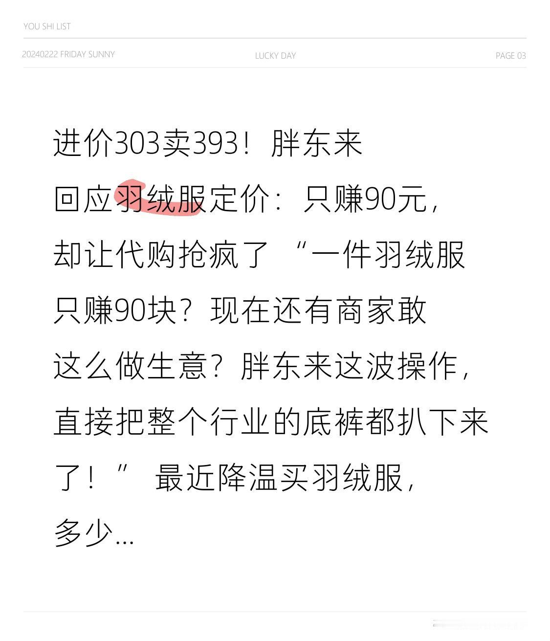 进价303卖393!胖东来回应羽绒服定价:只赚90元,却让代购抢疯了 “一件羽绒服只赚90块?现在还有商家敢这么做生意?胖东来这波操作,直接把整个行业的底裤都扒下来了!” 最近降温买羽绒服,多少人被动辄几千的价格劝退?要么是充绒量不足80克的“薄款”卖2000多,要么是标着“90%羽绒”实际掺了飞丝,消费者花了钱还得靠攻略辨真假。可河南的胖东来偏不按常理出牌,一款柒顿鹅绒服直接把进价303.9元、售价393元印在吊牌上,毛利率才22.8%,还附上第三方质检报告,明明白白写着90%绒子含量。 这还不算完,胖东来直接回应全网质疑:“我们就是赚合理利润,不搞虚的”。要知道,行业里同类配置的羽绒服,商场品牌能卖到1500-2000元,加价倍率高达5-7倍,毛利率普遍在60%以上,有的甚至能到80%。网友算过一笔账:同样300元成本的羽绒服,线上无牌货卖600-900元,高端品牌直接飙到3000+,而胖东来只加90元就敢卖。 更颠覆认知的是转折:这么便宜的羽绒服,不仅没滞销,反而被抢疯了!许昌门店里排起长队,白色小码款断货一个月,二手平台上代购加价30-50元照样秒空,甚至有人跨省驱车几百公里去抢购。东北网友实测:“零下20度穿它,搭件薄毛衣就够用,保暖性堪比千元大牌”,还有人说“面料好洗,用湿巾一擦污渍就没了”。 面对代购热潮,胖东来再次回应:“不建议代购,没法保证售后”,还明确表示无补货计划,坚持让消费者到店享受保障。其实这不是胖东来第一次“反向操作”,之前3毛利润的促销羽绒服、10%利润上限的平价药品,早就靠“透明经营”圈粉无数。它能做到低价,靠的是规模化直采砍中间商,不搞明星代言和花哨营销,把省下来的钱全让给消费者。 网友们彻底炸了:“这才是良心商家!赚该赚的钱,不玩套路”“对比那些卖2000多充绒86克的品牌,胖东来太实在了”“我们要的不是廉价,是明明白白的性价比”。也有人质疑“这么低利润能撑住吗?”,但胖东来用单店年450万人次的高客流证明,真诚才是最好的生意经。 说到底,消费者反感的从来不是商家赚钱,而是被信息不对称收割。胖东来用一件羽绒服证明:好生意的底层逻辑,从来不是漫天要价,而是“一分钱一分货”的真诚。希望更多商家能明白,把知情权还给消费者,让普通人花小钱买好货,才是最动人的商业本质。 你愿意为这样的“实在经营”买单吗?你买羽绒服踩过哪些坑?评论区聊聊,也转给身边正在买冬装的朋友,一起避坑省钱!