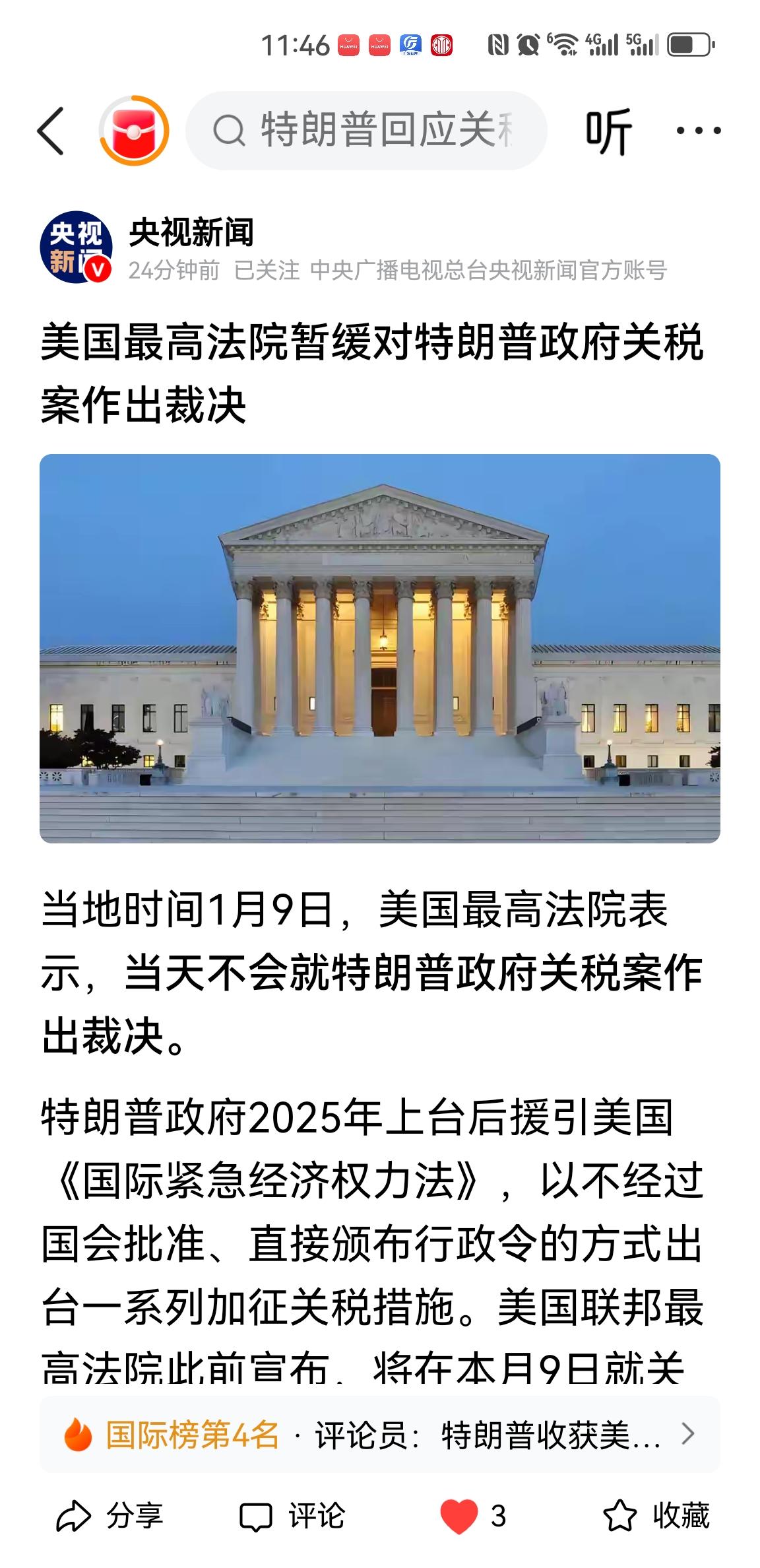 最新消息:美国最高法院暂缓对特朗普关税案裁决,别指望美国制衡能拦着特朗普的关税“打劫”! 美国最高法院暂缓对特朗普关税案的裁决,看似是权力制衡在运作,实则不过是缓兵之计——别天真以为这套内部机制能拦住特朗普对全世界、尤其是对中国的“打劫”操作! 2025年特朗普政府上台后,直接绕开国会,援引《国际紧急经济权力法》就推出加征关税的行政令,说白了就是把“紧急状态”当幌子,行单边贸易保护之实。如今最高法院推迟裁决,与其说是制衡,不如说是美国政治体系内部的“磨洋工”:要么是在权衡利益,要么是等着看特朗普下一步动作,根本不是要从根源上否决这种霸凌行径。 对中国而言,这事儿更该敲醒警钟:特朗普的关税牌从来不是“依法行事”,而是赤裸裸的经济霸权。美国的三权分立也好,司法制衡也罢,在涉及对华博弈的核心利益上,往往只会成为“走过场”的工具。此前特朗普政府对中国商品加征关税的操作,早已让中美贸易蒙上阴影,如今这套手段卷土重来,即便美国法院暂时不裁决,也改变不了其搞贸易保护、转嫁国内矛盾的本质。 说到底,美国的内部制衡从来不是全世界的“保护伞”,特朗普的关税大棒一旦挥起,受损的不仅是中国企业,更是全球产业链供应链的稳定。与其指望美国的司法体系“良心发现”,不如咱们自己练好内功,筑牢产业链、拓展多元化市场——这才是应对霸权主义最硬的底气!