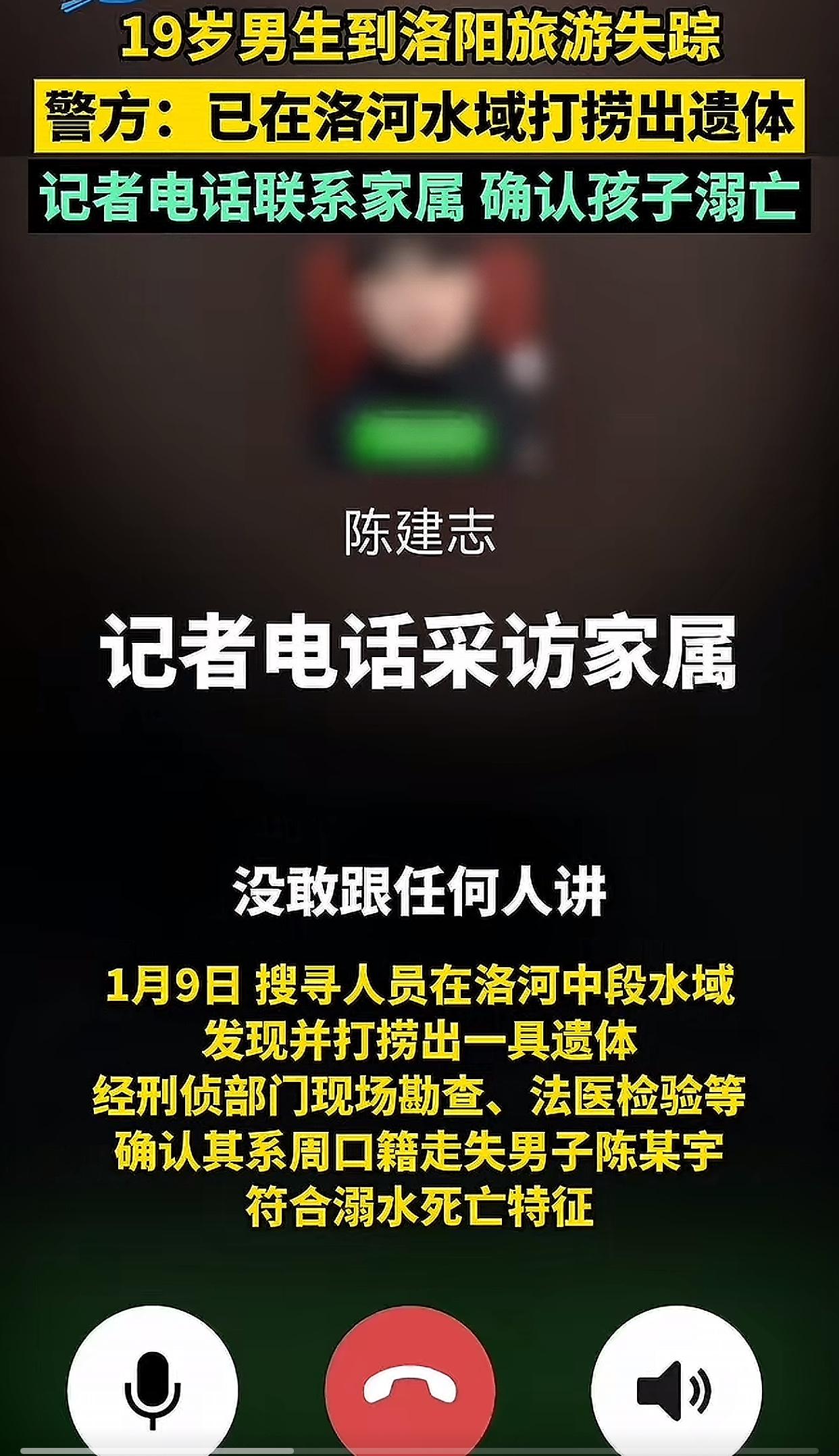 洛阳失联26天的19岁周口男孩陈某宇被找到了 只是再也回不了家了! 警方在洛河中发现他的遗体,确认溺水身亡,排除刑事案件可能,家属也认可了这个死因。 12月初孩子独自去洛阳旅游后失联,父亲对着镜头一遍遍恳求,希望大家帮忙留意孩子的信息,那满眼的慌乱与期盼,看着心里格外难受。二十多天里,家属和警方在洛浦公园、洛河周边反复搜寻,始终抱着希望,就盼着孩子能平安出现。 监控里最后拍到他,是骑着共享单车往洛浦公园去,搜救犬也在河边停下了脚步。孩子出门前说和朋友同游,实则全程孤身一人,一场青春的旅行,终究成了永别。他才19岁,正该好好看世界的年纪,生命却戛然而止。 二十多天的焦灼期盼,换来天人永隔的噩耗,这份丧子之痛,家人该有多难熬。愿少年一路走好,盼他的家人能慢慢熬过这段至暗的日子,愿每个出门的人,都能平安归家!