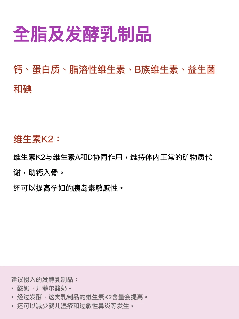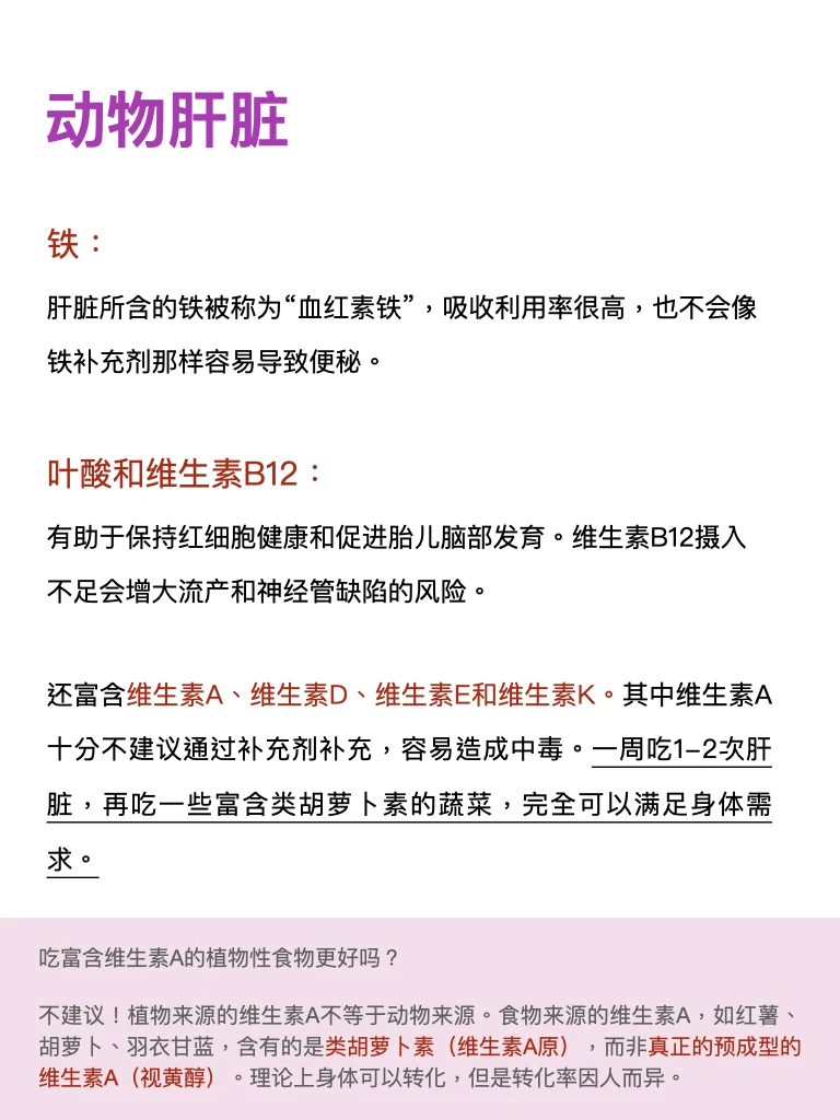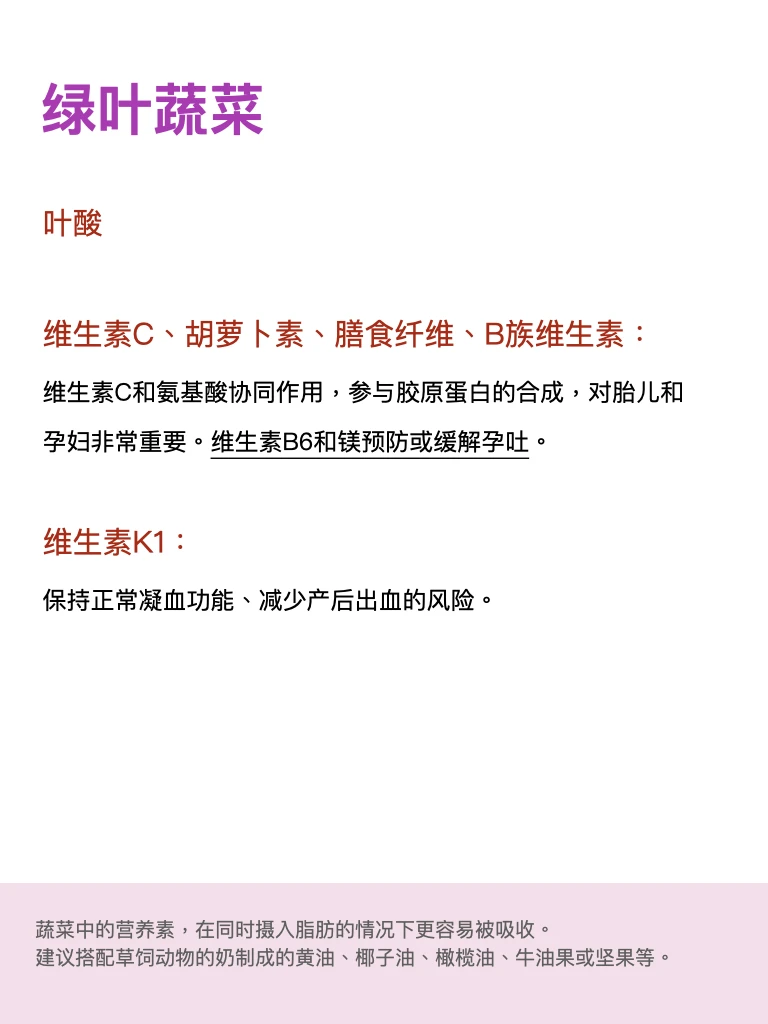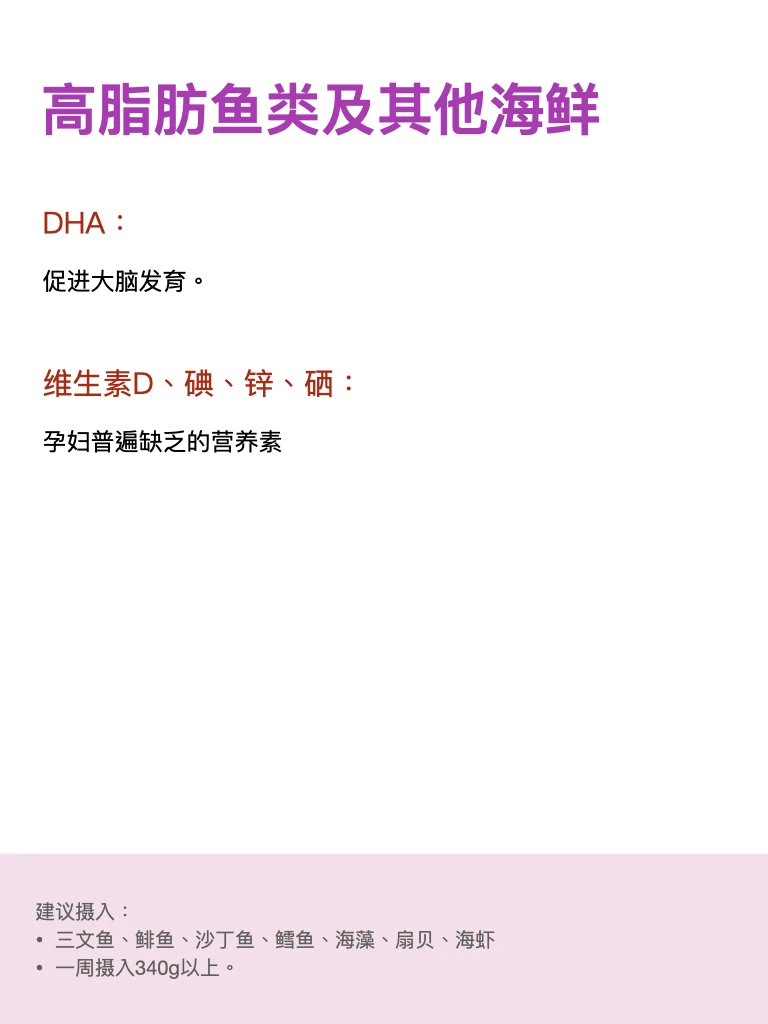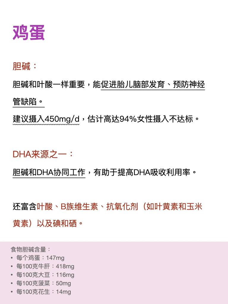 饭可以不吃,但是这些食物每天都要安排起来。 特别是对于食量小的小孕妇,更需要营养密度高的食物! 叶酸、DHA、钙、蛋白质大家是最耳熟能详的啦,但是除了叶酸,其他营养素同样重要。比如胆碱、甘氨酸、脂溶性维生素(维生素A、维生素K、维生素K)、B族维生素、铁、镁、碘、锌、硒都太重要了!!! 而且这些食物大多数存在于动物性食物中。食物里面的营养素是补充剂无法比拟的,它们会更容易吸收,而且天然食物中不同营养素能共同作用起到1+1>2的作用哦,如果不是素食主义的宝宝,尽量都靠食补吧~