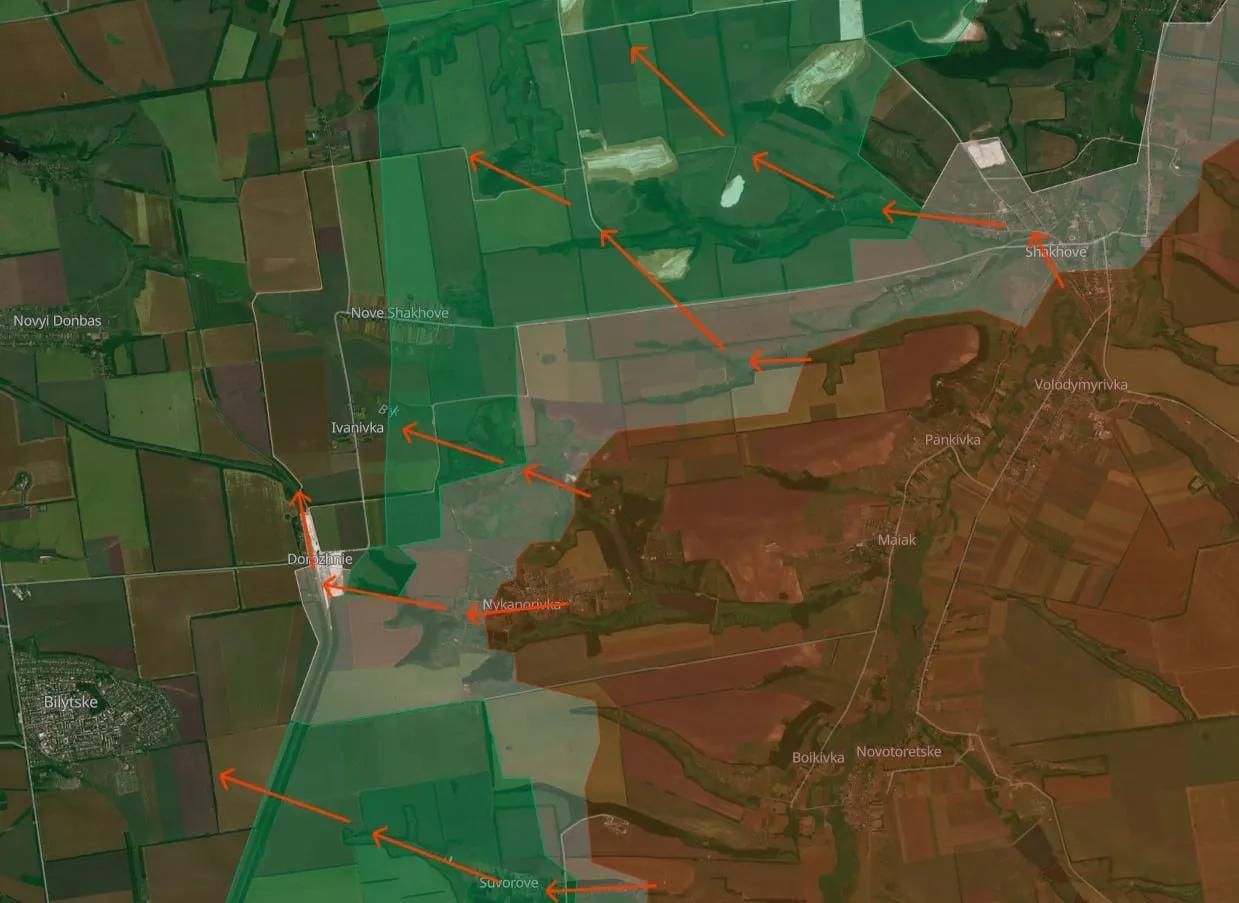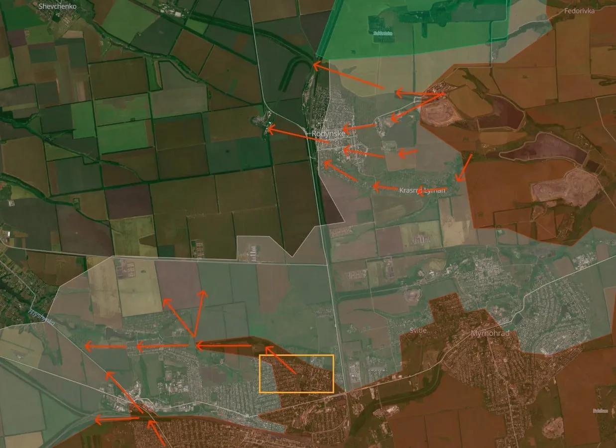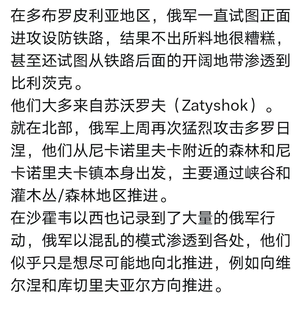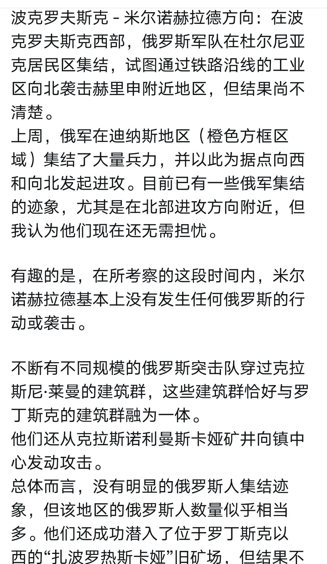 从多布罗皮利亚到红军城(波克罗夫斯克与米尔诺格勒)战况: 俄军主攻格里希诺,但仍未成功; 俄军在罗金斯克没,遭到乌军反击,失去了稳定阵地。但俄军基本控制了克拉斯诺利曼矿区,可从此向南经红利曼东侧,进攻米尔诺格勒乌军。 多布罗皮利亚,俄人加大攻势。俄军控制扎茨绍克和尼卡诺洛夫卡。 顿涅斯克战况