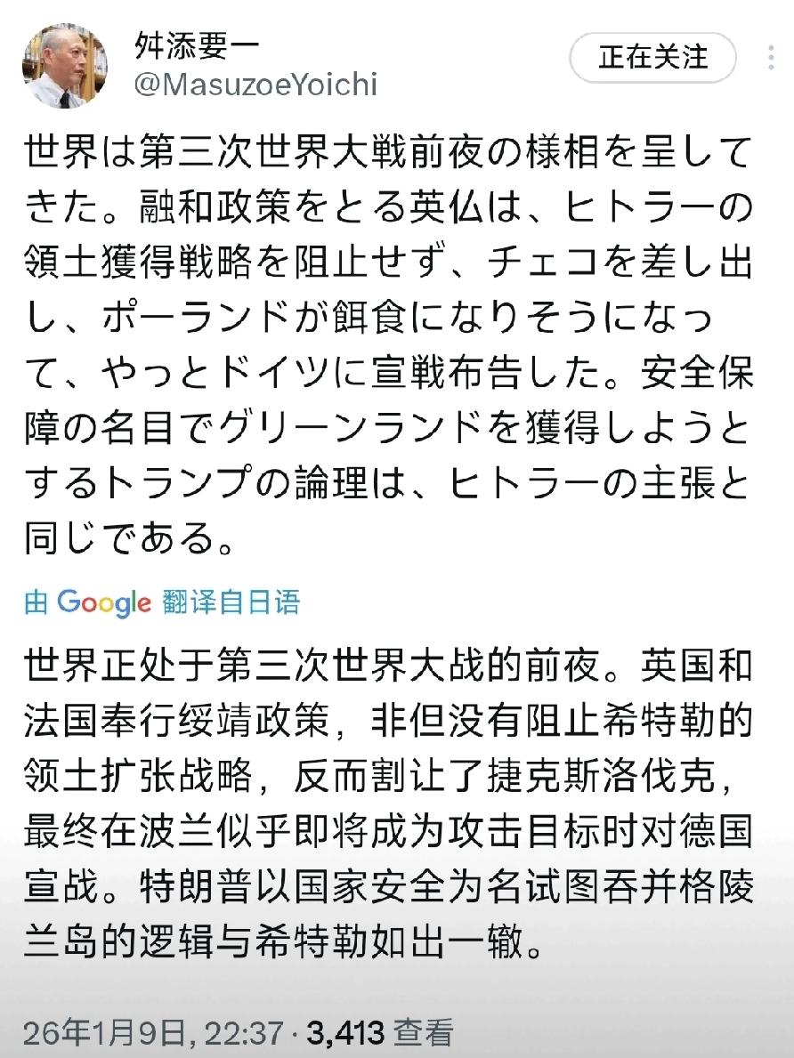 昨晚,前东京都知事、厚生劳动大臣、日本政坛“争议高材生”舛添要一写道:“世界正处于第三次世界大战的前夜,英法奉行绥靖政策,非但没有阻止希特勒的领土扩张战略,反而割让了捷克斯洛伐克,最终在波兰似乎即将成为攻击目标时对德国宣战,特朗普以国家安全为名试图吞并格陵兰岛的逻辑与希特勒如出一辙!” [机智]霸权碰瓷法西斯,日本前政要一语戳穿特朗普侵略底色!舛添要一这话堪称神吐槽,1938年慕尼黑协定,英法卖捷克斯洛伐克苏台德区求苟安,换不来和平反加速二战爆发;今特朗普以安全为名谋吞格陵兰,逻辑与希特勒侵捷如出一辙,何其讽刺!昔日希特勒借民族借口扩土,今日特朗普拿战略价值夺岛,动辄威胁动武,连1951年美丹防务条约都弃如敝履,更可笑欧美复刻绥靖,嘴上喊尊重主权,实则对美霸权噤声,一如当年纵容纳粹...... 二战60多国20亿人遭殃的血泪犹在,美国却重蹈侵略覆辙,一边侵委国夺资源,一边窥格陵兰谋霸权,还敢对台海说三道四,舛添这番话,是落魄政客的清醒,更是霸权末路的注脚,谁再纵容美式侵略,终将重蹈英法覆辙!
