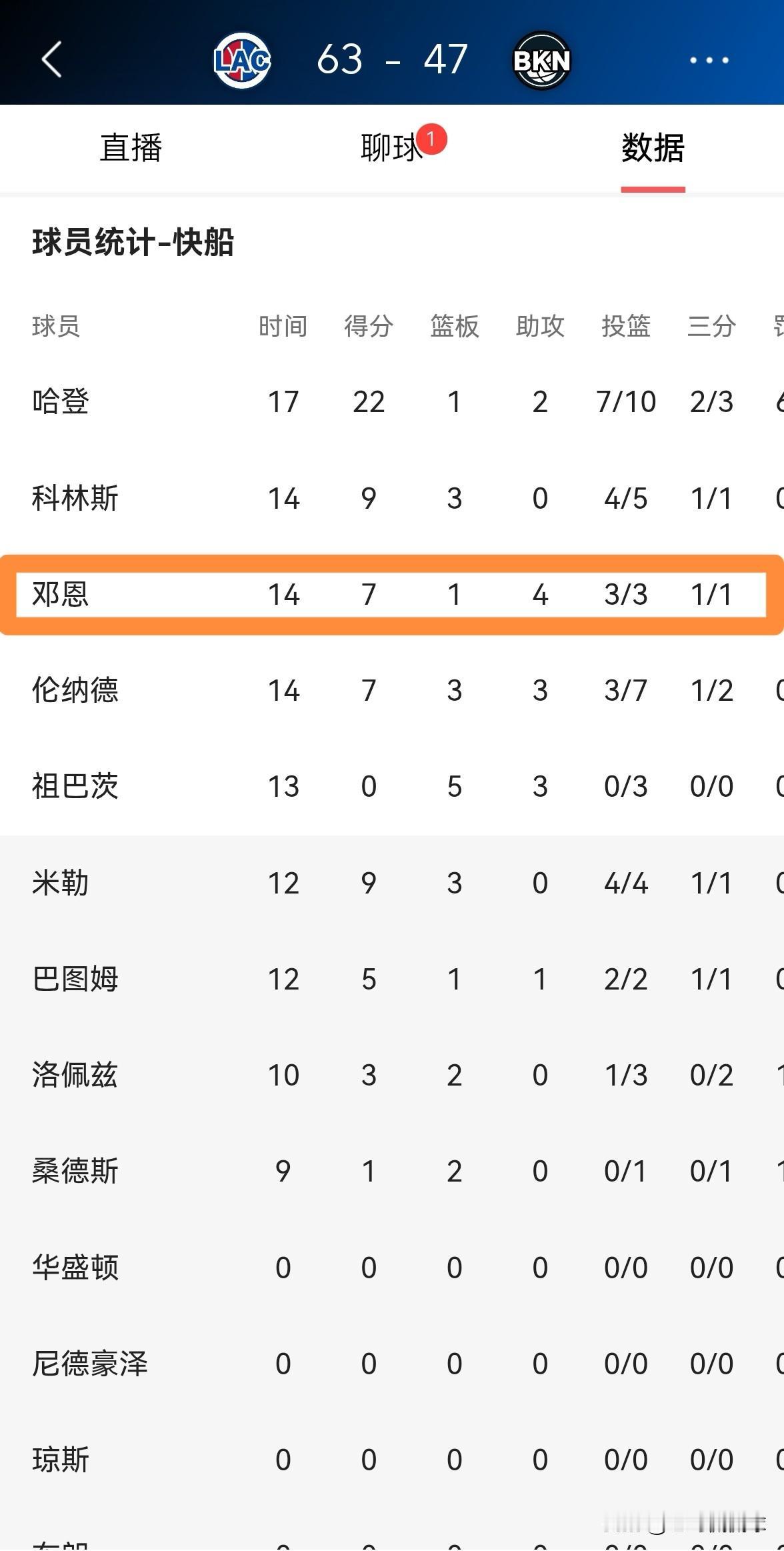 我必须要好好地夸夸快船大将邓恩!在今天快船客场挑战篮网的比赛中,目前双方半场战罢,快船暂时以63:47领先对手。在前两节比赛中,邓恩首发出战14分钟,投篮3中3,其中三分球1中1得到7分1篮板4助攻1抢断,没有出现失误,他的场上正负值为+11。 坦白说,上半场比赛中的邓恩出色的完成了自己的任务,无论是投进空位三分还是组织串联和防守,邓恩的表现都非常不错。