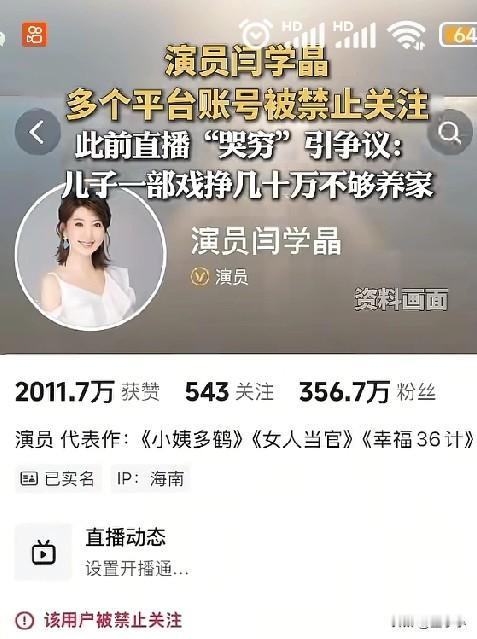 认怂了? 演员闫学晶此刻恐怕也是后悔莫及了吧! 没料到自己吐槽的事情,给自己引来这么大的麻烦。 演员闫学晶在网上哭穷,并描述自己的儿子一部戏赚几十万不够养家的,引起了公愤。 如今,她的多个平台账号已经被禁止关注了。 几十万不能活,那普通人上12个小时,一年不到十万,不还是一样活?