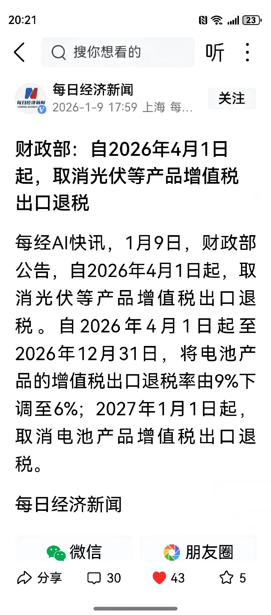 中国财政部和税务总局宣布了 4月1日起,光伏出口退税,全面取消!电池退税,分步清零!退税率先从9%降到6%,撑到2027年,也彻底取消。 这个消息是财政部和税务总局1月8日发布的正式公告,自2026年4月1日起生效。这意味着,从2013年左右开始、曾高达50%的光伏产品出口退税政策,完成了它的历史使命。对于电池产品,政策则留出了更长的缓冲期,2026年底前退税率降至6%,2027年起才完全取消。 为何在此时“断奶”?核心就一个词:“内卷外化”。 过去一段时间,中国光伏产业在海外陷入了严重的低价恶性竞争。部分企业为了抢订单,不仅压价,甚至把国家给的出口退税额也当成降价空间,一起让给了外国买家。这导致一个好政策变了味:原本为减轻国内企业税负的财政补贴,最终补贴了海外市场,自家企业没多赚钱,还背上了“倾销”的嫌疑,贸易摩擦风险大增。行业协会说得直白,这损害了中国光伏产业的整体利益和国际形象。 取消退税,是一剂“退烧药”,目标是让行业回归理性。 这相当于从成本端给所有企业“托底”,大家没法再靠拼退税来打价格战了,海外市场的非理性低价有望回升。实际上,行业自律已经起效,2025年前十个月出口额降幅已大幅收窄,“反内卷”初见成效。此时取消退税,能巩固成果,倒逼企业从“价格战”转向“价值战”。 影响是立体的,企业感受冷暖不一。 对大型龙头企业,他们品牌、技术优势强,定价权也高,政策冲击相对较小,反而能趁机清理市场。压力最大的是那些技术含量低、靠退税维持微薄利润的中小产能,淘汰出清会加速。特别是电池环节,利润波动会比组件更剧烈。 更深远的意义在于,这标志着中国光伏全球化进入2.0阶段。 过去是“产品出口全球”,未来要转向“产能布局全球”。政策会驱动更多企业直接去欧洲、中东、北美等主要市场附近建厂,实现本地化生产,这样才能真正绕过贸易壁垒,赢得长远发展。 把目光放远,全球能源转型的大趋势没有变,光伏需求的基本盘依然稳固。 国际能源署预测,到2027年全球可再生能源产能将比现在扩大75%,光伏是绝对主力。中国光伏产业历经风雨,早已不是当年的稚嫩孩童。取消退税是成长的阵痛,更是走向真正强大的成人礼。这迫使全行业停下无序扩张的脚步,潜心修炼技术、提升品牌、优化全球布局。短期看是挑战,长期看,是为中国光伏下一个十年的全球引领地位夯实基础。 各位读者你们怎么看?欢迎在评论区讨论。