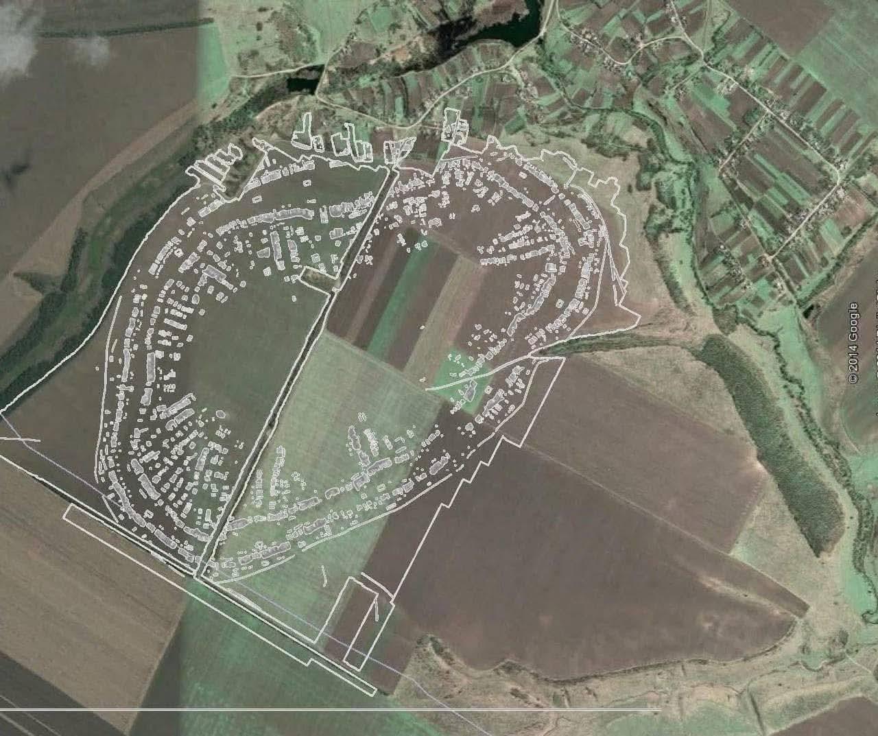 这是英国地球物理学家于2009年至2013年间绘制的位于基洛沃格勒州内贝利夫卡村附近的特里波列文化大型聚落(公元前4千年)的平面图。勘测通过磁成像技术将卫星照片叠加到遗址上,在238公顷的土地上发现了超过1400座建筑,包括防御工事和内贝利夫卡神庙。 比迈达涅茨克更古老,位于其以南25公里处。该平面图已叠加在卫星图像上。新一代仪器的出现使得绘制出比1971-74年迈达涅茨克平面图更为详细的平面图成为可能。两处聚落的布局相似之处令人瞩目:内部椭圆形建筑群和外围椭圆形区域之间留有70-100米的空隙。在这两个区域的空隙中,都建有十几座小型寺庙。在两个聚落的中心区域,都可以辨认出街道和街区的发展轨迹。因此,从一开始,这些庞大的聚落就是按照这种模式建造的。 2009年至2013年英国对乌克兰基洛沃格勒州内贝利夫卡·特里波列遗址进行的地球物理勘测。勘测通过磁成像技术将卫星照片叠加到遗址上,在238公顷的土地上发现了超过1400座建筑,包括防御工事和一座中央神庙。