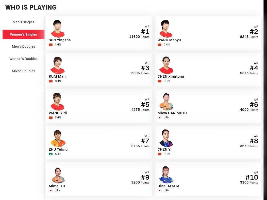 新加坡大满贯赛初始名单出来了。 按世界排名来邀请的,协会限6个名额(奥运金卡除外),排名靠前的都被圈进来了。 国乒男单7人在列: 王楚钦、林诗栋、梁靖崑、向鹏、陈垣宇、周启豪、陈俊菘。 女单8人在列: 孙颖莎、王曼昱、蒯曼、陈幸同、王艺迪、陈熠、石洵瑶、何卓佳。 图为男女单前10名名单。