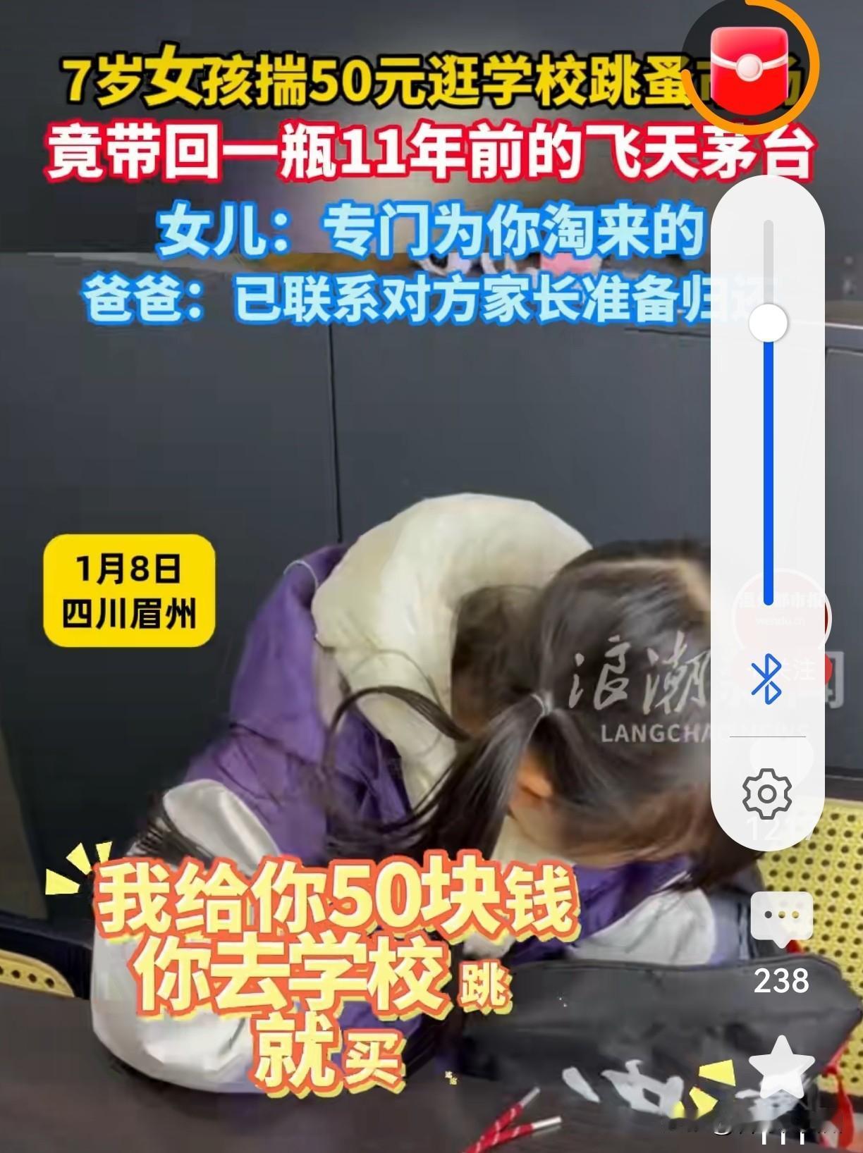 50块淘到11年飞天茅台!7岁娃送爸爸的酒,结局让全网点赞! 你敢信?一个7岁小姑娘,拿着逛跳蚤市场的50块钱,没买玩具没挑零食,居然抱回一瓶11年前的飞天茅台!说是要给爱喝酒的爸爸一个惊喜。可爸爸一看酒瓶,脸色变了——立马掏出手机:“这酒得还回去!” 那天学校跳蚤市场热闹得很,孩子们摆摊卖闲置,谁家都翻出点用不上的小物件。小姑娘兜里揣着50元零花钱,逛来逛去,一眼相中角落里一个漂亮的白色瓷瓶。摊主同学说:“这酒瓶好看,我家没人喝,50块给你吧!”孩子心里惦记着爸爸平时抿酒的样子,觉得“瓶子又精致又贵重”,高高兴兴掏钱捧回家。 爸爸刚看到酒,确实一愣——这飞天茅台的标、这陈年的包装,明显是真货!市场价少说大几千。可他没急着高兴,反而蹲下来问女儿:“你怎么想到买这个呀?”女儿眼睛亮晶晶:“爸爸喜欢喝酒,这个瓶子最好看,我想送你!”爸爸心里一暖,紧接着却认真说:“宝贝,这酒太贵重了,卖的同学家可能不知道它的价值,咱们不能这样占便宜。” 说完,他当即联系了对方家长。果然,那家人翻出来时只当是普通摆设,压根没注意年份。两边家长一沟通,爸爸坚持把酒还了回去,还顺手给女儿包里塞了50块钱:“你的心意,比这瓶酒更珍贵。” 这事儿传开后,好多人感叹:一瓶老酒,照出了两种光。一边是孩子纯粹的孝心——她不懂行情,只知道“爸爸喜欢”;一边是父亲瞬间的抉择——不是自己的,再值钱也不能要。茅台有价,但孩子的爱和家长的格局,无价。 你看,跳蚤市场里“淘”到的哪是闲置啊?分明是人性的镜子:孩子用天真照亮孝心,大人用诚信托起榜样。有时候,教育的答案不在课本里,就在这一还一送之间。如果你是这家长,会怎么处理?你家娃又送过什么让你哭笑不得的礼物? 评论区等你聊聊!
