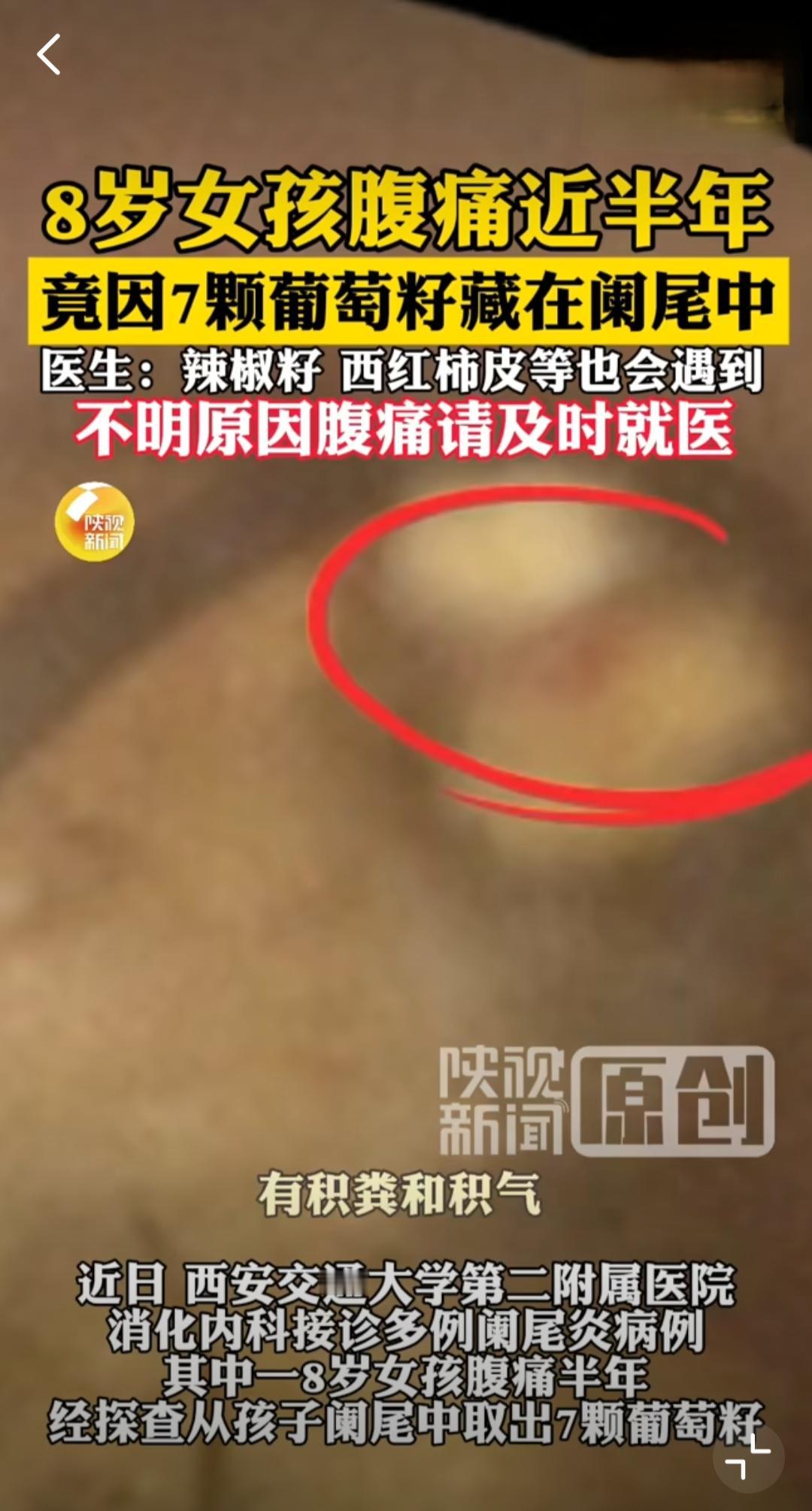 陕西西安有个8岁的小姑娘,半年来被反复的腹痛缠上了身,疼起来的时候坐也不是站也不是,家里人带着她跑了好几趟医院,也没查出个确切的原因。直到这次来到西安交通大学第二附属医院的消化科,才终于揪出了藏在身体里的“罪魁祸首”。 谁也没想到,让孩子遭了这么久罪的,竟然是七颗小小的葡萄籽,它们悄悄藏在孩子的阑尾里,一待就是半年。这些平时吃进嘴里嚼吧嚼吧就咽下去的小东西,怎么就成了伤人的“暗器”呢?原来葡萄籽外壳坚硬,小孩子的消化功能还没发育完全,吃下去之后没办法被肠胃消化分解,就这么在肠道里“溜达”,最后溜进了相对狭窄的阑尾里。时间一长,不仅堵住了阑尾的通道,还引发了炎症,这才让孩子隔三差五地肚子疼。 接诊的医生们没有贸然给孩子开刀,而是选择了一种更温和的微创手术——肠镜下逆行阑尾镜冲洗与扩张技术。这种技术不用在肚子上开刀,而是通过肠镜逆行进入阑尾,既能把藏在里面的葡萄籽全都冲洗出来,又能对发炎的部位进行处理,最重要的是能完整保留阑尾的功能,对孩子的身体损伤特别小。手术进行得很顺利,那些在阑尾里“安家”的葡萄籽被一一清理干净,困扰孩子半年的腹痛根源也彻底被铲除了。 术后没过多久,小姑娘就恢复了正常的生活,又能像别的小朋友一样蹦蹦跳跳地玩耍、吃饭了。负责治疗的消化内科主治医师乔璐说,其实在临床中,像这样因为误食小异物引发阑尾问题的情况并不少见,除了葡萄籽,辣椒籽、西红柿皮这些不起眼的东西,都有可能成为“隐患”。尤其是小孩子,吃东西的时候往往狼吞虎咽,不会仔细咀嚼,就更容易让这些小物件溜进消化道里。 这件事也给很多家长提了个醒,要是家里的孩子出现不明原因的反复腹痛,可千万别不当回事,也别自己随便给孩子吃止痛药,一定要及时带孩子去医院检查。很多时候,那些看起来微不足道的小细节,可能就是影响身体健康的关键,早发现早治疗,才能让孩子少受些罪。腹痛