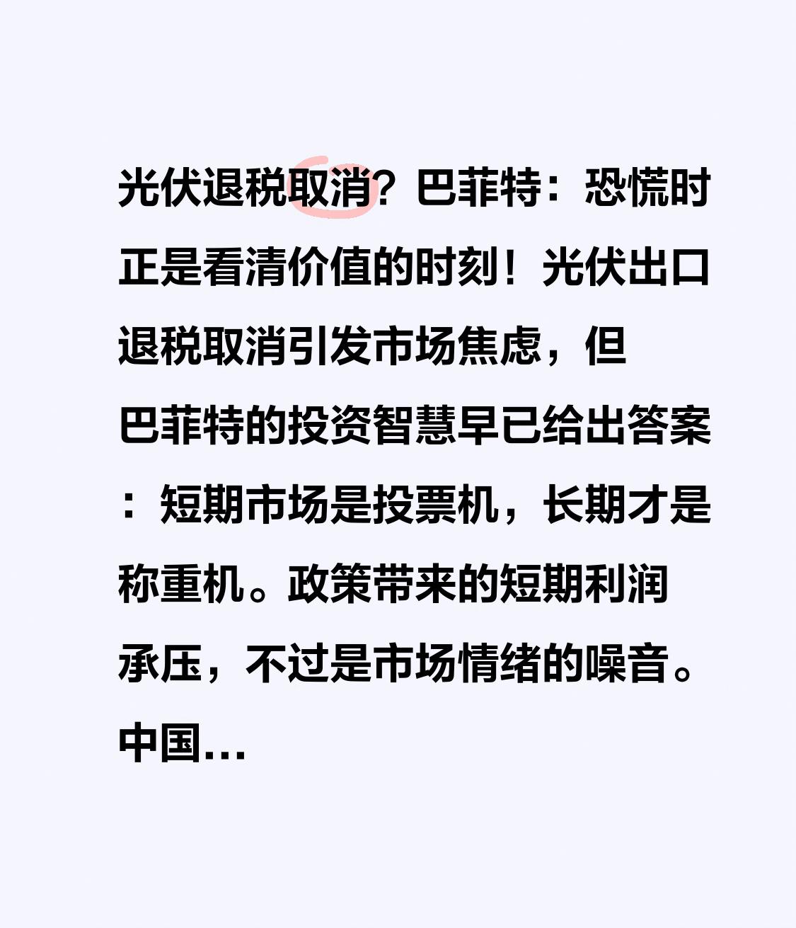 光伏退税取消?巴菲特:恐慌时正是看清价值的时刻! 光伏出口退税取消引发市场焦虑,但巴菲特的投资智慧早已给出答案:短期市场是投票机,长期才是称重机。 政策带来的短期利润承压,不过是市场情绪的噪音。中国光伏全球市占超八成的格局未变,全球新能源需求增长的长坡仍在,退税取消实则加速落后产能出清,让资源向有技术护城河的龙头集中——这正是优质企业的价值所在。 “在别人恐惧时贪婪”,真正的投资者从不被短期波动裹挟。光伏产业高质量发展的逻辑未改,耐心持有具备核心竞争力的企业,时间终将兑现复利价值。