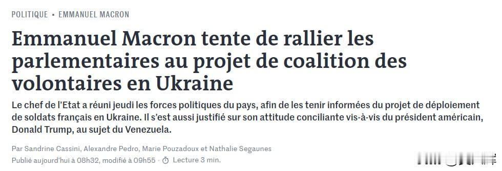 马克龙与议会党团讨论战后向乌克兰派兵事宜 1月10日,《世界报》报道,法国总统马克龙已与各议会党团领袖举行磋商,议题涉及乌克兰战争结束后,包括法军的外国军队在乌克兰的可能性部署安排。 报道称,议会各党团领袖对提议的军队部署模式未提出实质性反对意见。 马克龙进一步明确,此次讨论的并非在前线部署军队。国际部队计划部署在乌克兰的后方,据称是为了对乌克兰军队进行监督与支援。