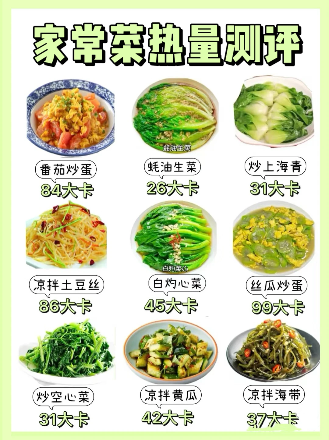 ✅以上均以,一份100g计算 ✅家用盘子的话,一份大约为300g左右 ✅食堂或中式快餐小份菜的话,一份大约是100g~150g左右 ‼️注:以上数据均来源于薄荷, 炒菜油用多一点,热量也会变高哦!! 热量整理(个人自用版)有需要姐妹可以参考看看~