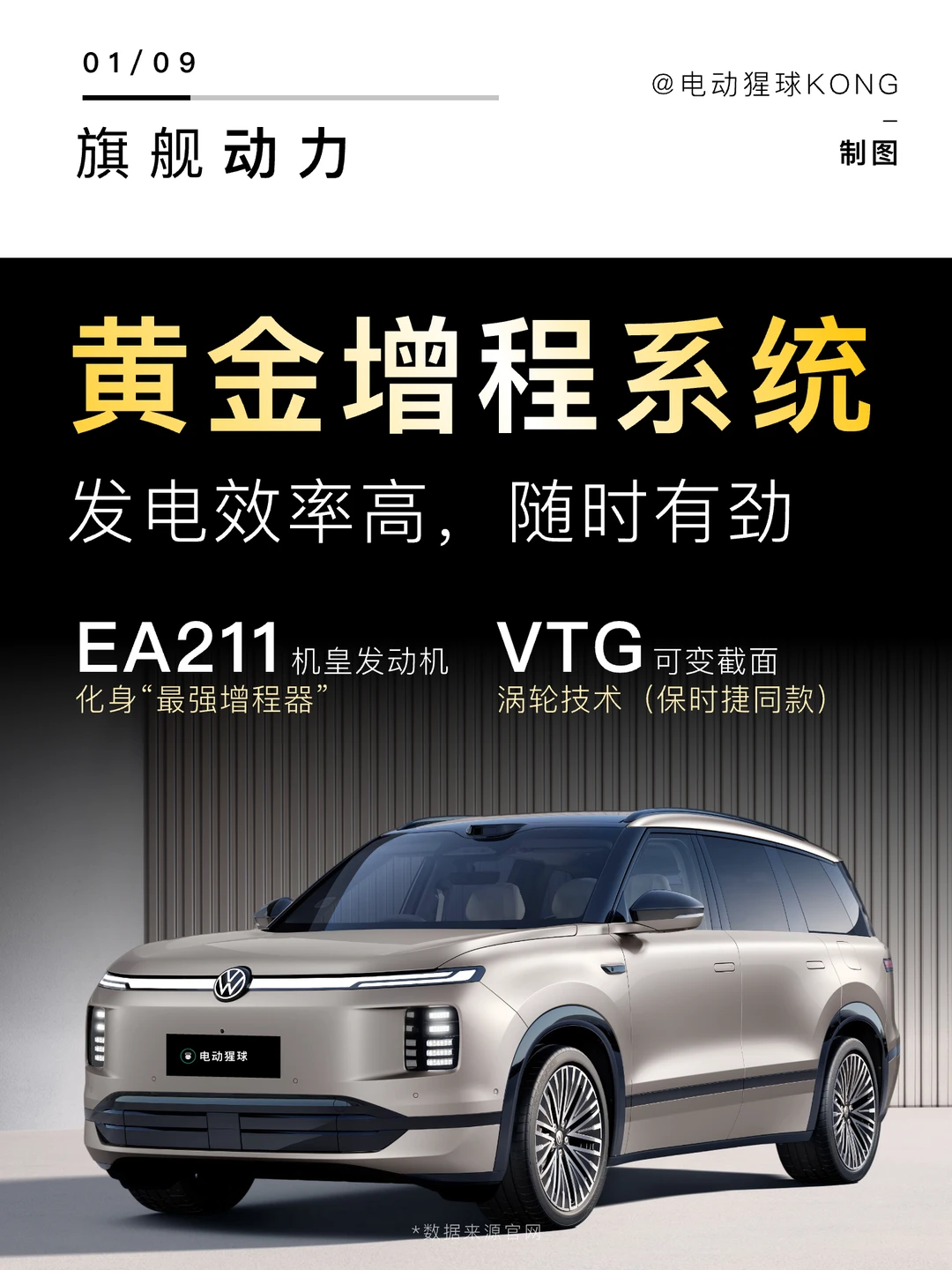 采用EA211发动机作为增程器,搭配保时捷也在用的VTG可变截面涡轮技术和米勒循环技术。相比不知名的增程器导致亏电油耗高,震动大等问题相比,大众这套EA211下放增程系统可以说是降维打击,日常通勤省油,高速超车也能跟上节奏