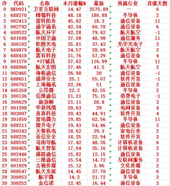 卫星互联网概念,一月以来涨幅最多的30名单汇总一览 卫星互联网(板块指数):本月上涨 14.47%,已连续 6个交易日上涨; 臻镭科技:本月上涨 48.18%,最新价 180.88元,已连涨 2天; 雷科防务:本月上涨 45.82%,最新价 18.30元,强势连涨 11天; 通宇通讯:本月上涨 42.34%,最新价 60.78元,已连涨 6天; 航天环宇:本月上涨 42.28%,最新价 79.62元,昨日回调(连涨天数为 -1); 中国卫通:本月上涨 37.08%,最新价 48.98元,已连涨 11天; 乾照光电:本月上涨 35.81%,最新价 37.43元,已连涨 3天; 航天电子:本月上涨 34.57%,最新价 28.69元,已连涨 2天; 震有科技:本月上涨 31.76%,最新价 57.29元,已连涨 4天; ST铖昌:本月上涨 27.62%,最新价 116.99元,已连涨 11天; 航天宏图:本月上涨 27.46%,最新价 41.50元,已连涨 2天。