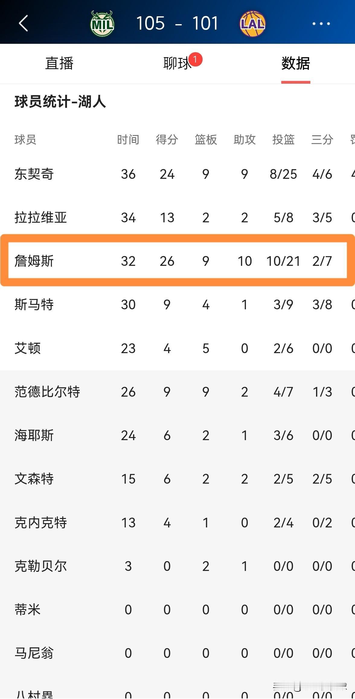 湖人超级球星詹姆斯真是倾其所有了!虽然今天湖人在主场以101:105惜败于雄鹿,但是41岁的詹姆斯在攻防两端都拼尽全力,做到了虽败犹荣。 全场比赛下来,詹姆斯首发出战32分钟,投篮21中10,其中三分球7中2、罚球6中4得到26分9篮板10助攻3抢断,他的场上正负值为+8。 对于一名41岁的老将来说,詹姆斯能够在这样一场高强度的比赛中打出如此全面的表现,真是让人佩服的五体投地。