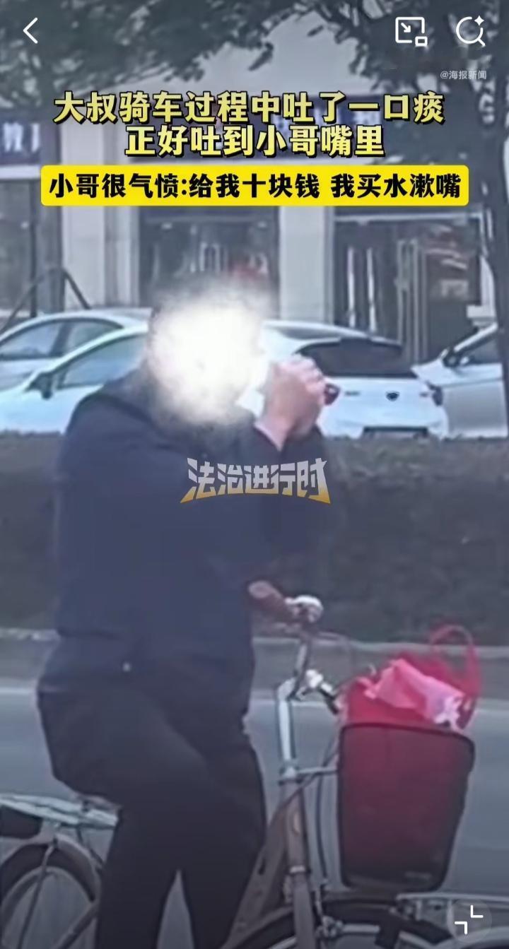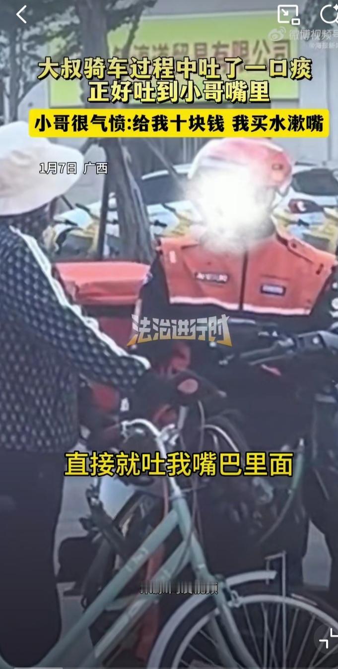笑不活了,世上竟有如此巧合之事——一位大爷骑车吐痰,正好吐入小伙子嘴里😂 这场邂逅堪称神来之笔。广西钦州街头,一位大爷骑着自行车悠然自得,一位外卖小哥紧随其后。当小哥和大爷并排骑行时,大爷扭头吐痰,痰经过空气助力,似一条抛物线精准飞入小哥口中!😂 小伙子一阵恶心,捂着嘴干呕,停下车与大爷理论,要求大爷支付10元的漱口费。大爷连连抱拳致歉,声称自己喝了酒,一时大意。小伙怒斥:“喝不喝酒也不能往人嘴里吐”。大爷自知理亏,赔了小伙10元钱的漱口费。网友“光听着就恶心,小伙子太善良,换我得洗胃”。 听说过吐痰吐到别人衣服上的,也有吐到别人头上脚上的,从未听说过吐到别人嘴里的。大爷的精准程度超越射水鱼,射水鱼是在静止状态下对猎物瞄准射击,而大爷是在移动状态下,显然大爷的技术“更胜一筹”。 小伙子要是快一秒或者慢一秒,就会躲过大爷的“精准打击”,网友惊叹“巧合度堪比中彩票”。确实如此,要是两位买彩票,绝对并列一等奖。 不要随地吐痰幼儿园小朋友都懂啊,大爷你是白活了吗?你的素质有待提高啊,遇到善良的小伙子算你幸运,换个人恐怕就不是10元钱能解决的。