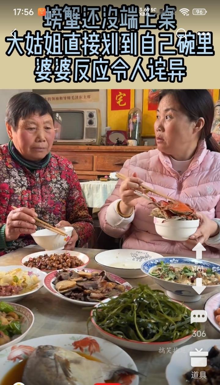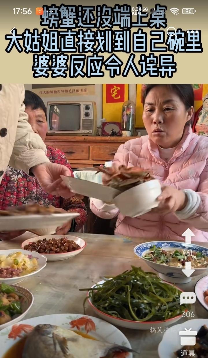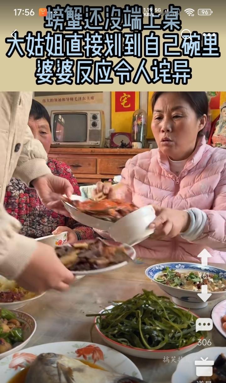 一家子聚会一起吃饭。 一盆蟹才端上来,大姑姐伸出空碗,扒拉一下子,就把整盆蟹都扒拉到自己碗里了。 好像一辈子没吃过饱饭似的。 这样的亲戚,不走动也罢了。