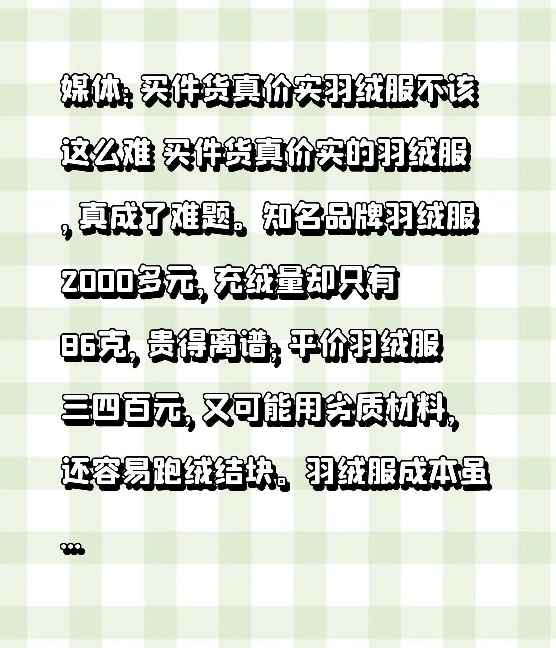 媒体:买件货真价实羽绒服不该这么难 买件货真价实的羽绒服,真成了难题。知名品牌羽绒服2000多元,充绒量却只有86克,贵得离谱;平价羽绒服三四百元,又可能用劣质材料,还容易跑绒结块。 羽绒服成本虽高,但如今价格虚高。今年90%纯度白鸭绒420 - 550元一公斤,一件常规短款按150克绒算,成本才78块起步,加上其他费用也不该动辄两千多。消费者为不踩坑成了“羽绒鉴定师”,可还是可能栽跟头。大家只想简单买件好羽绒服,这行业乱象真该整治整治了。