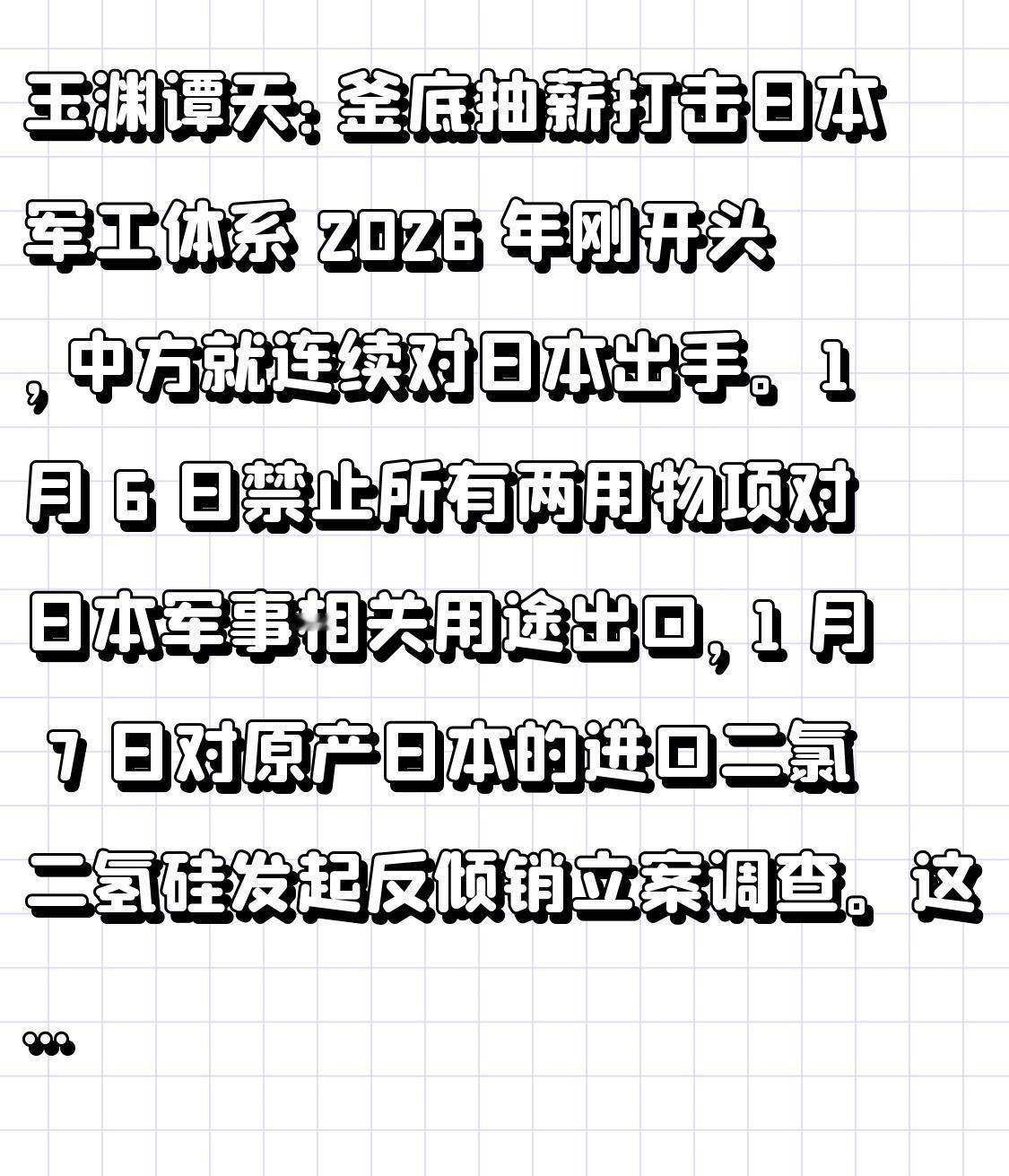 玉渊谭天:釜底抽薪打击日本军工体系 2026 年刚开头,中方就连续对日本出手。1 月 6 日禁止所有两用物项对日本军事相关用途出口,1 月 7 日对原产日本的进口二氯二氢硅发起反倾销立案调查。这可不是小打小闹,出口管制覆盖超 900 种物项,涉及诸多产业链,尤其针对军工。 日本把军工产能藏在民用产业里,像三菱重工、三菱电气等民用巨头,实则是防务订单核心承包商。但日本军工核心材料高度依赖中国供应链,比如导弹推进剂核心原料端羟基聚丁二烯、穿甲弹芯等刚需的钨粉、雷达制导系统离不开的稀土。中方这波釜底抽薪,直击日本军工体系命门,是对其右翼扩武的强力回击。
