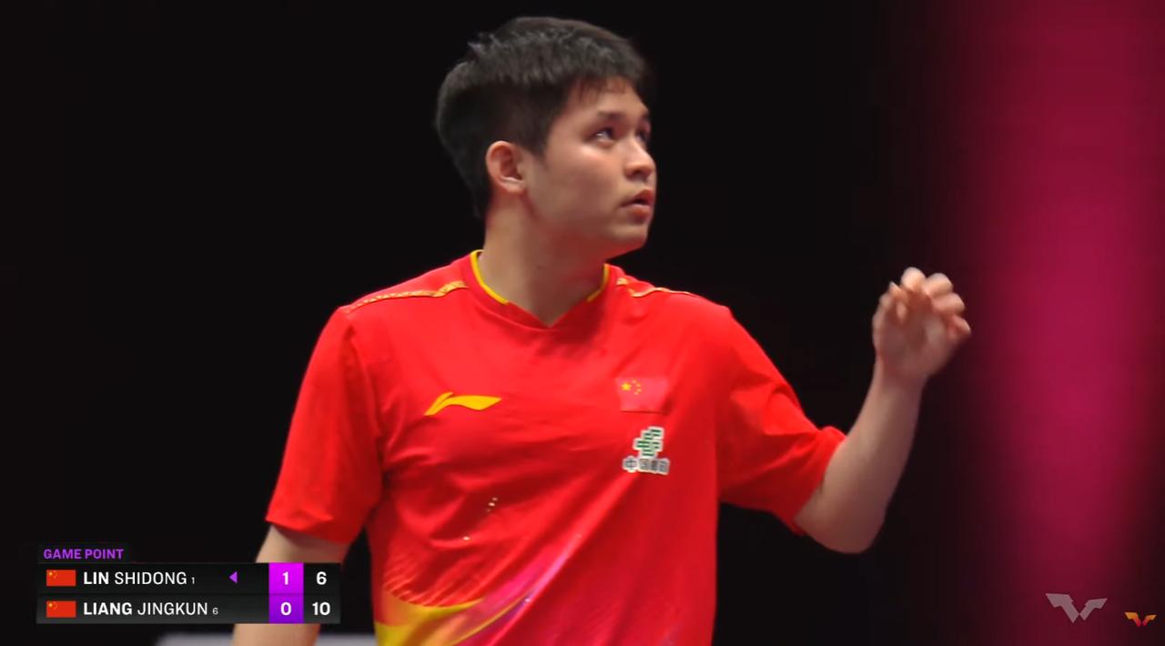 坏了,林诗栋脾气失控了,这下麻烦了! 第二局开局 林诗栋中局领先, 然后两人一个世界对拉, 林诗栋输了, 怀疑的看着球拍, 心态有些失衡, 结果连续失误。 梁靖崑10:6这个球, 石头本来想搓短, 结果撞网了, 气的石头用力将球用力拍到地上。 我听吧嗒,球应该是瘪了, 还好, 石头没有因为损坏乒乓球拿到红牌。 最后石头6:11输了。