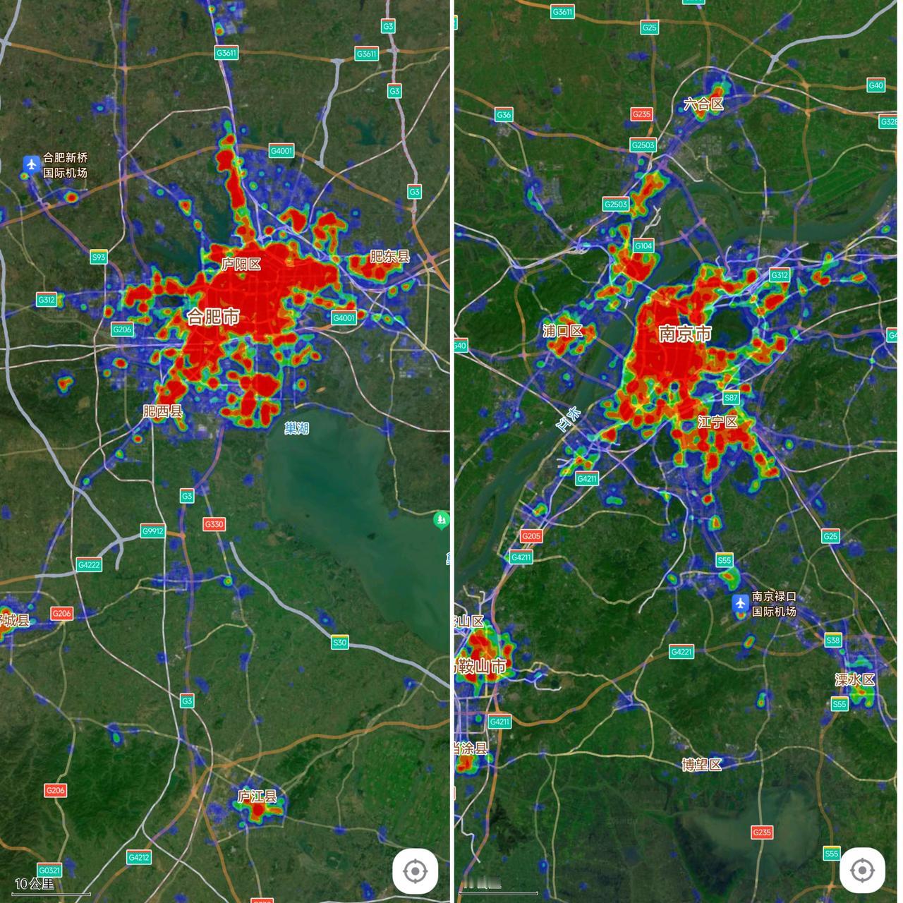 从城市热力图看合肥红色区域面积大于南京,合肥的蓝色区域面积小于南京。从这个细节可以看出合肥城区人口密度更高,南京城区面积更大。 由于合肥这座城市工厂规模庞大,因此外来务工人员更多,放眼未来还需要继续扩大市区面积,大力发展新城区。 对于南京来说还是要加强对外地人的吸引力。现在看来江北新区与江宁区还是有很大的提升空间,想要达到河西的水准还需要加把劲才行。