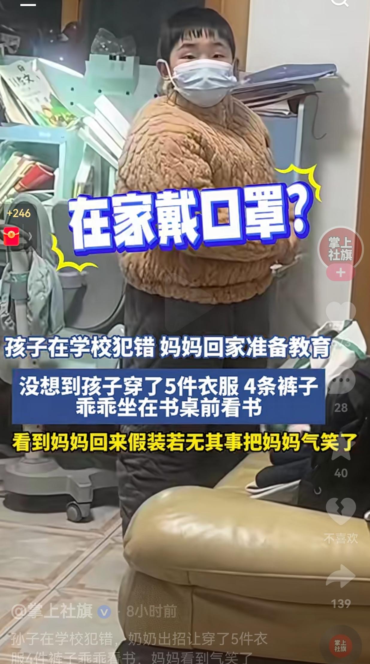 笑不活了!1月10日,安徽一小男孩在学校犯了错,他知道这件事情肯定免不了一顿打了,因此,他就把这件事情原原本本地告诉了奶奶,想要寻求奶奶的庇护。 奶奶为了自己的宝贝孙子,竟然想出一个招,那就是给孙子穿了5件衣服、4条裤子,同时,还让孙子戴着口罩,乖乖坐在书桌前看书。 孙子听从了奶奶的建议,就照做了,因此,当妈妈回来找他算账的时候,他还假装若无其事地样子在书桌前读书。 妈妈把儿子叫到了身边,看到孩子带了个口罩,穿得特别笨拙,直接把妈妈气笑了。 妈妈说:“你怎么穿成这个鬼样子啊!” 男孩小心翼翼地说:“今天有点冷,我就多穿了点。” 可是,明眼人一看就知道,怎么可能是因为天气冷呢?分明他是知道自己在学校犯错了,肯定要挨揍了,穿厚点,挨打就不疼了所以,他才会这么做。 网友看到后评论说:“奶奶这招绝了,既不跟儿媳对着干,又保护了孙子,真的是高情商建议!” 也有的网友说:“奶奶这是‘物理减伤’啊!隔代亲太真实了,我小时候奶奶也这么护着我。” 还有的网友说:“这画面我能笑一年!穿成这样,妈妈想揍都下不去手了吧。” 孩子知道自己犯错了,第一反应不是顶嘴,也不是撒谎,而是去找奶奶求助。 奶奶呢,也没说你没错,也没有护犊子,跟儿媳对着干,只是用自己的方式,悄悄给孩子加了一层“保护壳”。 妈妈呢,本来一肚子火,看到孩子那副笨拙又可怜的样子,也忍不住笑了出来,这样一来,气也消了大半。 这不就是我们普通家庭最真实的样子吗?没有什么大道理,就是在打打闹闹、说说笑笑里,把日子过下去,把孩子慢慢养大。