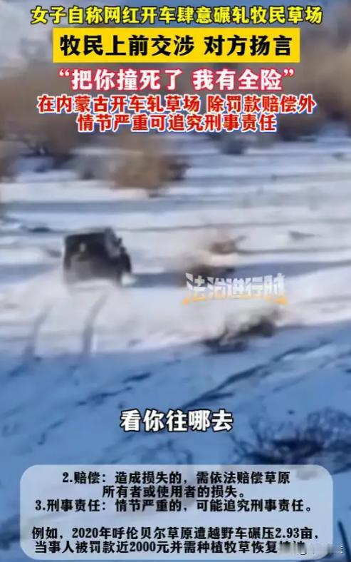 内蒙古赤峰,零下20多度,当地牧民的草场被厚雪覆盖,这可是牛羊过冬的指望,平时走路都舍不得踩。可这天,一阵刺耳的发动机轰鸣打破了宁静。一辆黑色越野车在草场横冲直撞,雪沫泥土飞溅,铁丝网被撞坏,雪地满是车辙,牧草遭殃。牧民赶来阻拦,车上时髦女子却满脸不屑,自称网红,还拿手机拍牧民,叫嚣有全险撞死人也能赔。周围牧民赶来指责,女子竟开车紧贴牧民擦边,后因心虚离开。这事发上网后,网友纷纷谴责女子没素质。 据大风新闻、法治进行时报道,2026年1月4日,一位牧民像往常一样,早早地来到草场,准备查看牛羊的情况。突然,一阵刺耳的发动机轰鸣声由远及近,打破了这原本的宁静。牧民心中一惊,赶忙朝着声音的方向望去。 只见一辆黑色越野车如脱缰的野马般,在雪地上横冲直撞。车轮所过之处,雪沫和泥土四处飞溅,原本平整的雪地被碾出了一道道深深的车辙。草场边缘的铁丝网,在越野车的撞击下,瞬间变得七零八落,摇摇欲坠。 牧民心疼得直跺脚,他顾不上寒冷,撒开腿就朝着越野车跑去,一边跑一边大声呼喊,试图阻止这疯狂的行为。 越野车终于停了下来,车门打开,一个打扮时髦的女子慢悠悠地走了下来。她戴着墨镜,穿着昂贵的皮草,手里还拿着一个三折叠手机。 牧民气得满脸通红,他指着被破坏的草场,对女子说道:你这是干什么呢?你怎么能这么糟蹋呢? 女子却满脸不屑,嘴角微微上扬,露出一丝嘲讽的笑容。她轻蔑地看了牧民一眼,说道:我管你这么多呢,我是网红,我想咋玩就咋玩。 说着,女子还掏出手机,对着牧民拍了起来,嘴里还不停地嘟囔着:就你们这些土 包 子,还敢来管我。 牧民又气又急,他上前一步,想要夺过女子的手机。女子却突然提高了音量,嚣张地叫嚣道:我有全险,撞死你们我也能赔,你们最好别惹我。 这时,周围的其他牧民听到动静,纷纷赶了过来。他们看到被破坏得一片狼藉的草场,个个义愤填膺。 大家你一言我一语地指责着女子,要求她赔偿损失,并立刻离开草场。女子看到这么多人围了过来,心里有些发虚,但她嘴上依然不肯服软。 她突然钻进车里,发动汽车,一脚油门踩了下去。越野车如一头愤怒的野兽,朝着人群冲了过来。 牧民们赶紧往旁边躲闪,越野车擦着一位牧民的身体开了过去,吓得那位牧民出了一身冷汗。女子开着车在草场上又胡乱转了几圈后,觉得情况不妙,便灰溜溜地离开了。 牧民们看着被破坏的草场,不知道该如何挽回自己的损失,更不知道该如何应对这个嚣张跋扈的女子。 一位年长的牧民叹了口气,说道:现在这些人,仗着自己有点钱有点势,就不把别人放在眼里,真是世风日下。 很快,这件事就被发到了网上。网友们看到视频后,纷纷谴责女子的行为。 有人说:网红就应该传递正能量,而不是仗着自己的身份肆意妄为。还有人说:全险不是她违法犯罪的挡箭牌,她必须为自己的行为付出代价。 依据《草原法》第六十八条规定,女子的行为属于破坏草原植被,需限期恢复植被,若造成损失还要承担民事赔偿,同时可能面临罚款。 女子危险驾驶威胁他人安全,会受到什么样的处罚? 根据刑法第一百三十三条之一规定,在道路上驾驶机动车,追逐竞驶,情节恶劣的,或者在道路上醉酒驾驶机动车的,处拘役,并处罚金。有前款行为,同时构成其他犯罪的,依照处罚较重的规定定罪处罚。 女子在草场驾车冲向人群,虽非传统道路,但同样威胁到不特定多数人生命安全,主观恶意大、风险高,若造成严重后果,可能构成以危险方法危害公共安全罪,面临更严厉刑罚。 即便未造成严重后果,其危险驾驶行为也违反治安管理处罚法,可处拘留、罚款。 女子破坏他人财产,会受到什么样的处罚? 民法典第一千一百八十四条规定,侵害他人财产的,财产损失按照损失发生时的市场价格或者其他合理方式计算。 女子撞坏铁丝网等行为,造成牧民财产损失,应按照市场价格或其他合理方式赔偿损失。 从法律层面来看,女子未经许可闯入草场漂移,撞坏围栏破坏植被,这种行为属于机动车离道行驶破坏草原植被。 根据相关法律规定,她不仅要限期恢复被破坏的草原植被,还要面临罚款和民事赔偿。 而且,她叫嚣撞人还危险驾驶威胁他人安全,主观恶意极大,风险极高。这种行为已经严重威胁到了他人的生命安全,应该从重处罚。 全险虽然可以在一定程度上承担民事赔偿责任,但对于她威胁他人等违法犯罪行为,保险是无法规避的。 女子仗着自己是网红又有全险,就肆意破坏他人财产,威胁他人生命安全。这种行为不仅违背了道德准则,更触犯了法律红线。 在法律面前,人人平等,无论你是网红还是普通人,都必须为自己的行为负责。 希望这起事件能给那些妄图以身试法的人敲响警钟,让大家明白,尊重他人,遵守法律,才是正确的为人之道。