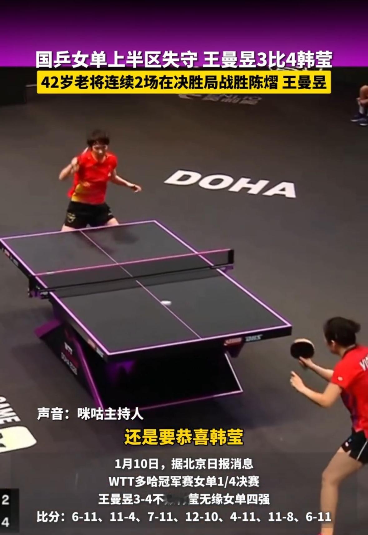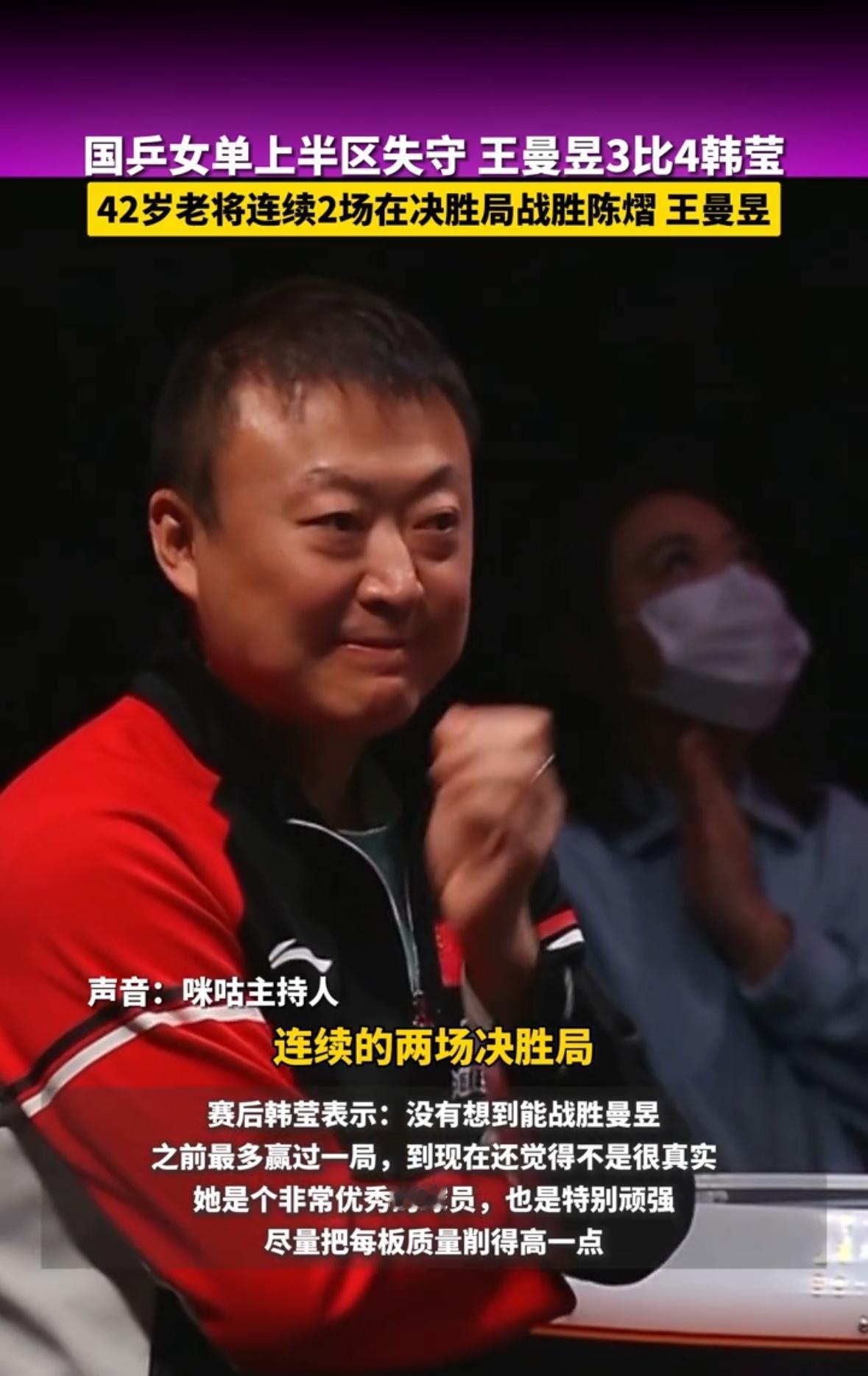姐姐是真难打,老将还是发挥的这么稳定,看到比分,曼昱输了也是超级厉害,马琳在比赛中都笑了,很骄傲了! 连穿 2 个国乒,韩姐确实是牛,比分都打满了,说明两个人都厉害! 必须肯定 40 多岁还有这个战斗力,问题是赢了国乒主力,王曼昱可是国乒的扛把子,毕竟都努力过了,没有什么不释怀!