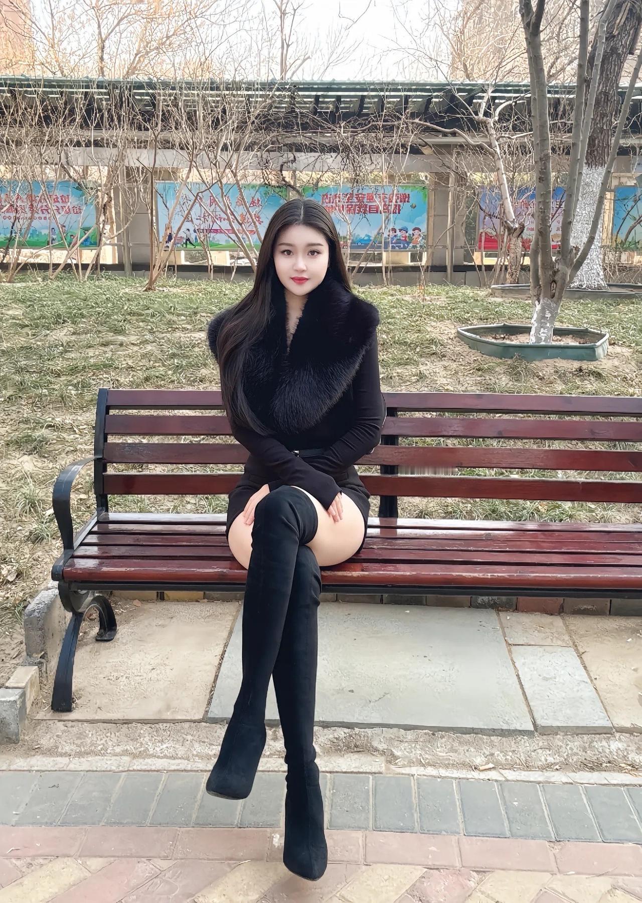 冬日暖阳下,黑衣少女静坐长椅,享受宁静时光。