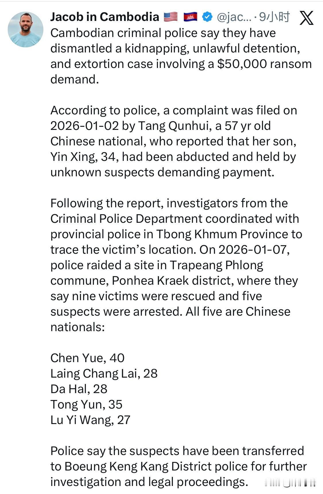 五名中国公民因涉嫌绑架和勒索指控在柬埔寨被捕。柬埔寨内政部刑事调查局的专业人员与特本克蒙省(Tboung Khmum)警察局合作,于2026年1月7日在该省成功展开了这次逮捕行动。 此次行动是在一名受害者母亲于1月2日报案后展开的。她报告称自己34岁的儿子被身份不明的人绑架并索要赎金。接到报案后,警方展开了调查,最终锁定了受害者的位置并实施了抓捕。 这5名嫌疑人均为中国公民。 Chen Yue, 40 Laing Chang Lai, 28 Da Hal, 28 Tong Yun, 35 Lu Yi Wang, 27 警方表示,嫌疑人已被移送至万景岗警区接受进一步调查和法律程序。