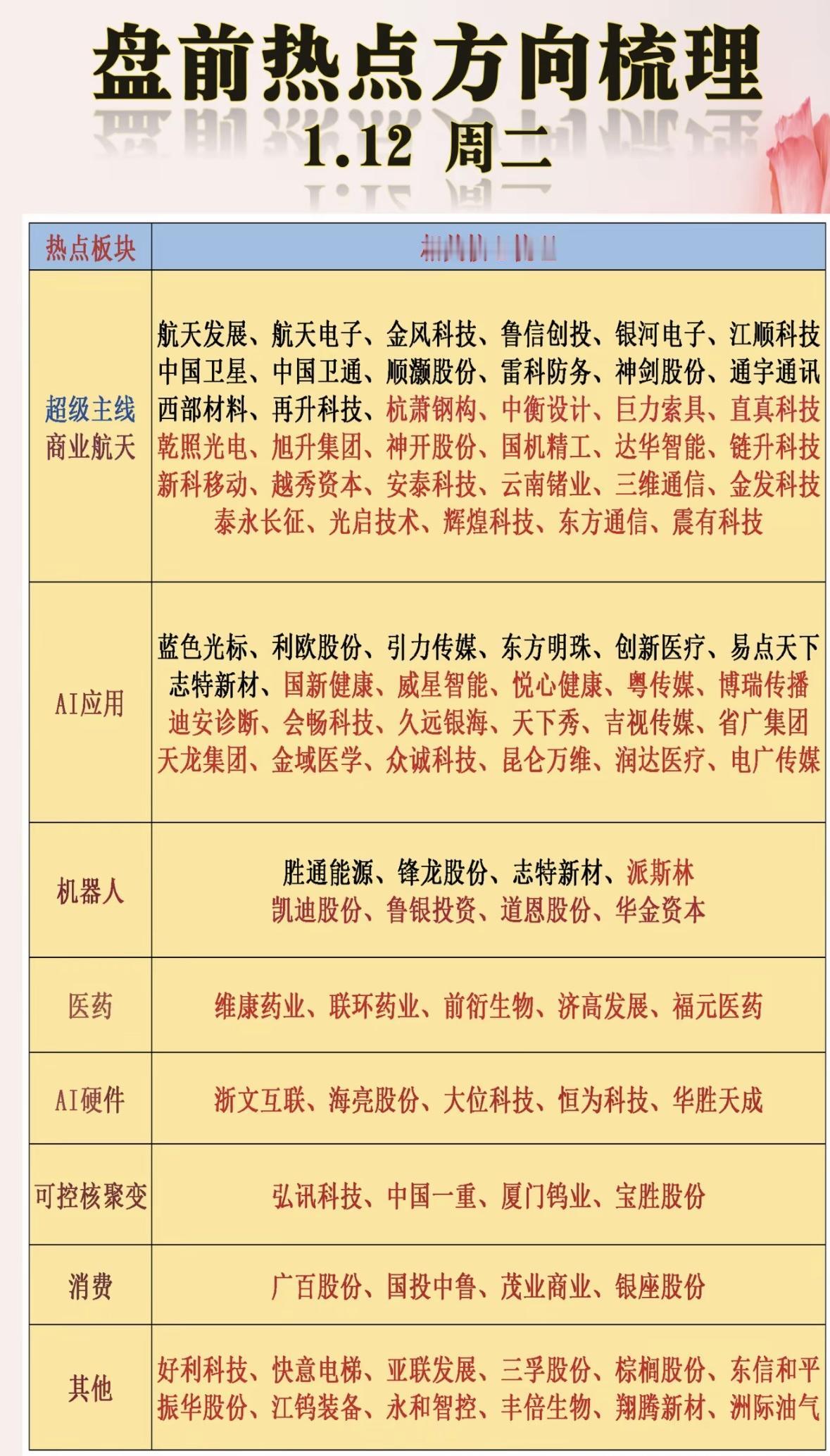 1月12日盘前热点方向梳理 1.12 周二 📈📊📈 "航天军工领涨,AI与医疗板块活跃,消费电子回暖,新能源异动,商业航天受瞩目。" "航天军工领涨,AI与医疗板块活跃,消费电子回暖,核聚变概念异动,商业航天受瞩目。"
