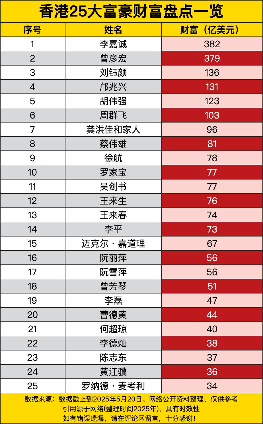 那李嘉诚稳稳坐在头把交椅上,身家382亿美元,这数字就跟天文数字似的。人家那财富积累,估计从清朝末年就开始攒了吧。再看曾彦宏,379亿美元紧随其后,这两位大佬就跟在财富赛道上并驾齐驱的超跑,把后面的人甩得那叫一个没影。 咱接着往下看,排名第3的刘钰颜136亿美元,和前两位一比,好像差了那么点意思。不过呢,在普通人眼里,这也是一辈子都花不完的天文数字啦。再往后,这财富数值就开始像坐滑梯一样,一路下滑。从100多亿到几十亿,感觉就像是财富在玩跳楼机,每降一点,都能让一群人望洋兴叹。 你瞧瞧这榜单里,有好多名字咱们可能都没怎么听过。但人家就是实实在在地拥有了巨额财富。就说这龚洪佳和家人,96亿美元,也不知道他们家是干啥的,咋就赚了这么多钱呢?还有那阮丽萍和阮雪萍,财富都是56亿美元,这双胞胎富豪,是不是在赚钱这事上也心有灵犀啊。 最后看看排名靠后的这些富豪,罗纳德·麦考利34亿美元,虽然在这25人里是倒数第一,可搁咱老百姓这儿,那就是妥妥的人生赢家啊。这榜单就像一面镜子,照出了贫富的差距。不过话说回来,人家能登上这个榜单,肯定也有过人之处。咱就当吃瓜群众,看看热闹,也祝自己哪天能发笔小财,哪怕沾沾这些富豪们的财气也行呐!