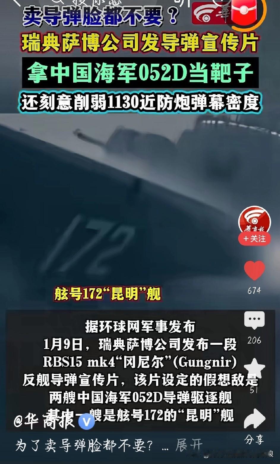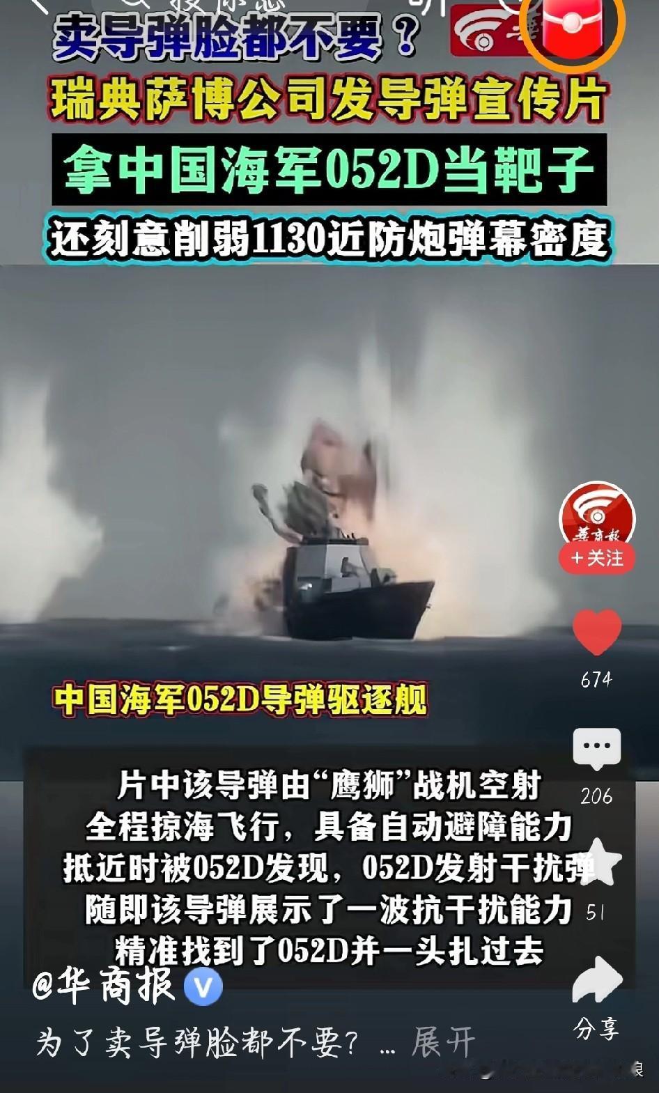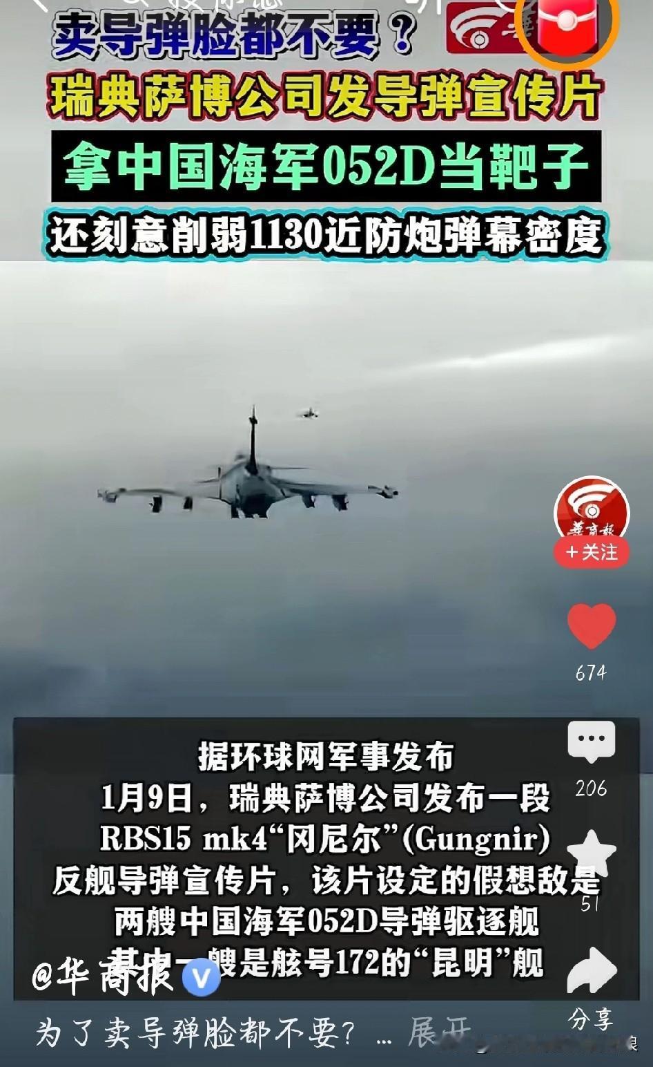 瑞典萨博玩碰瓷?拿052D当靶子卖导弹,真当咱没脾气? 最近瑞典萨博公司的操作太离谱了!为了卖自家RBS15 Mk4导弹,宣传片里直接把中国052D昆明舰当靶子打,还玩起了猫腻。 故意删掉052D的红旗10防空导弹,把一秒能喷1万发炮弹的1130近防炮调成“省电模式”,这不就像拆了防弹衣说自己小刀厉害吗?简直自欺欺人。 052D可是咱海军主力,64单元垂发+先进相控阵雷达,防空反舰样样能打,还有预警机和兄弟舰艇搭成的防护网,哪是单枚导弹能偷袭的? 说白了,这就是蹭流量的碰瓷营销,拿中国顶尖战舰当噱头,给客户画大饼。真打起来,体系作战下这导弹就是活靶子。别光靠宣传片吹牛皮,真有本事咱赛场上见高低! 你对052D驱逐舰有哪些了解 052D第四批次的黑科技有哪些 瑞典萨博发导弹宣传片拿052D当靶子 052D驱逐舰 军舰导弹 图片截图于