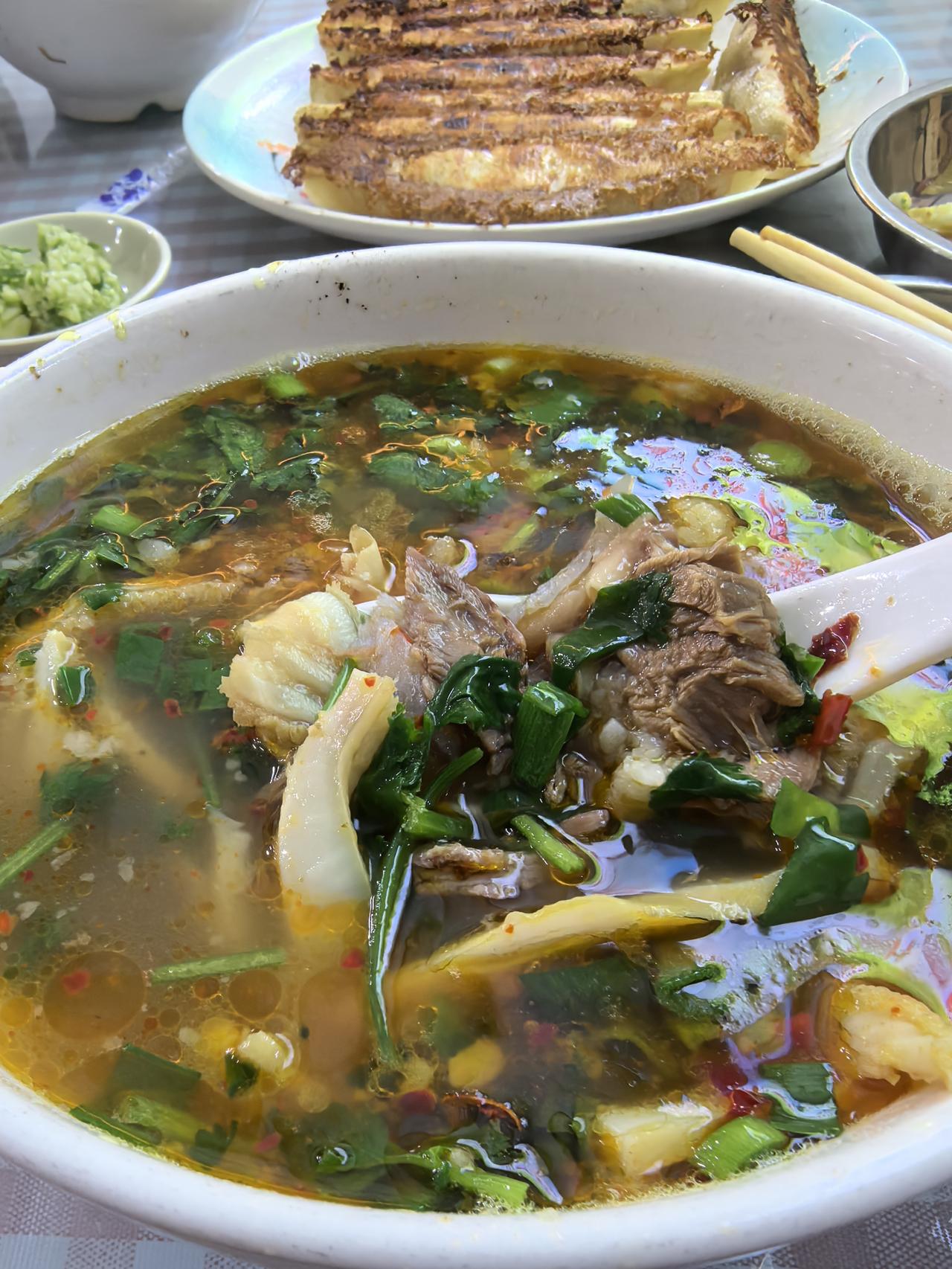 自驾去上海办事,全程800多公里,因为不想在服务区凑和,所以一般都是沿路线找个合适的、离高速口不远的城市吃点特色美食。 所谓的特色~自己家乡少有的 所谓的美食~适合自己口味的[呲牙] 蚌埠,对这座城市的印象一是徐蚌会战,也就是咱们说的淮海战役;二是这里有所海军院校,当年一个战友在这儿上学,其他的情况还真不熟悉,考虑到它离淮南很近,离蒙城也不远,咱也就中午过个饭时,不需要找大馆子吃大餐,于是果断锁定了牛肉汤! 汤醇肉香、小菜非常有特色,特别是牛肉大锅贴那叫一个绝!一句话~不虚此行啊!