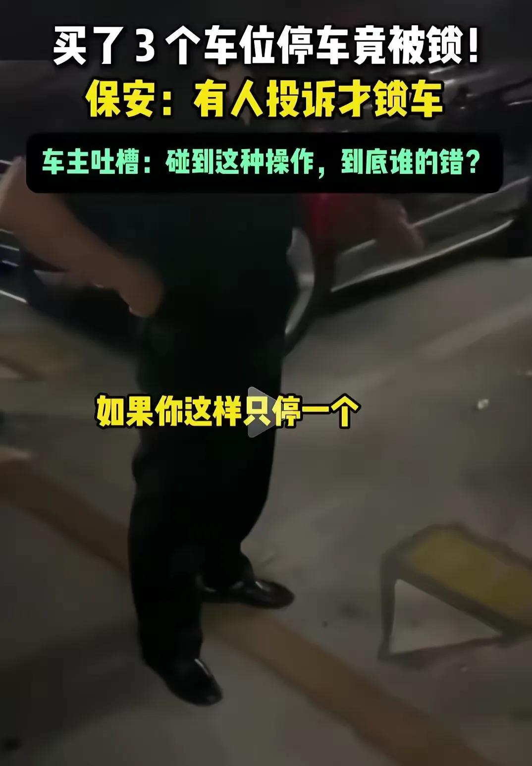 男子横着停车占了3个车位,有人向物业投诉,物业派保安把车锁了!男子:“3个车位都