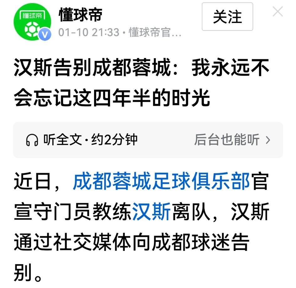 汉斯深情告别蓉城,蓉迷更应对他说一声“谢谢,顺利!” 成都蓉城守门员教练汉斯与蓉城球员球迷的告别姗姗来迟,字里行间可以看出他的不舍。 汉斯在蓉城4年半时间里,虽然很少出镜,从不显山露水,但从张岩、蹇韬、刘殿座等人优异表现、球队冲超到位居中超前列再打入亚冠,成为中超上赛季失球最少的球队,汉斯已经在此展现了超强能力。 如今这位置人选已由奥籍变澳籍,球迷对他更是不舍,理当表示深深的谢意,并祝福他未来万事如意![祈祷]