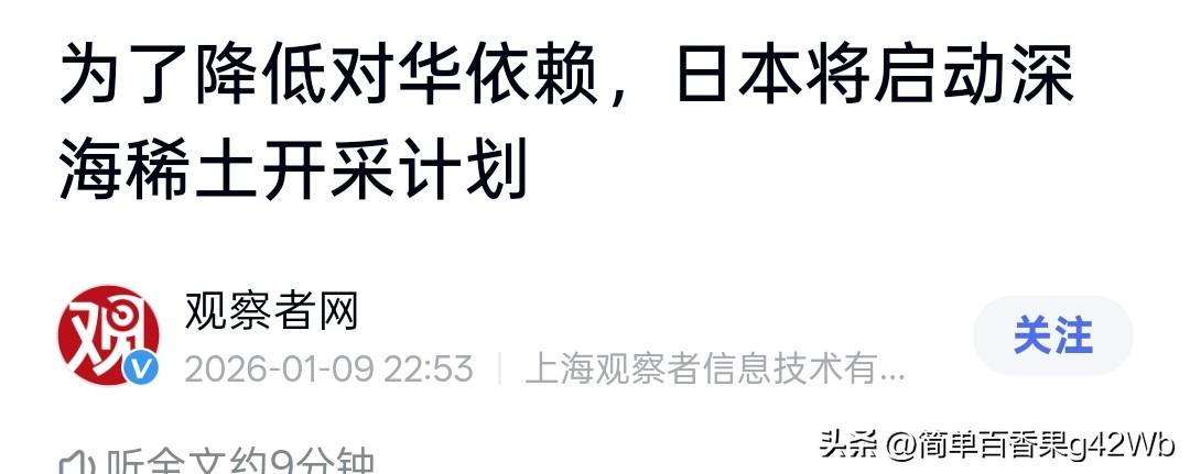 日本砸120亿,冲向6000米海底硬挖稀土!中国禁令一出,他们真急了? 为了减少对中国稀土的依赖,日本计划1月11日派遣深海钻探船“地球号”到南鸟岛海域试采稀土。这片海域距离东京约1950公里,蕴藏稀土储量超1600万吨,够用好几百年。 日本这么做是有原因的。 就在1月6日,中国商务部宣布加强对日稀土出口管制。而日本汽车、电子、军工产业极度依赖中国稀土,尤其是制造电动车和导弹用的镝、钇,几乎全来源于中国。面对中国供应“断链”的风险,日本只能走上这条最艰险的自救之路。 然而,深海开采任务面临许多问题: 1. 技术问题:6000米海底环境极端,压力巨大,设备一出事,全泡汤。 2. 成本问题:仅管道系统就投入约120亿日元。本次试采只计划抽取35吨海底泥,预计最多提炼70公斤稀土,这么算一吨稀土成本可能是中国的几倍。再者,与日本一年几千吨的需求比,根本不够看。 3. 提炼问题:全球约90%的稀土精炼产能在中国。日本即便开采出稀土泥,能不能搞出可用的材料还不一定。 这次试采要持续到2月14日,能不能行,三周后见分晓。 日本 中方稀土战略