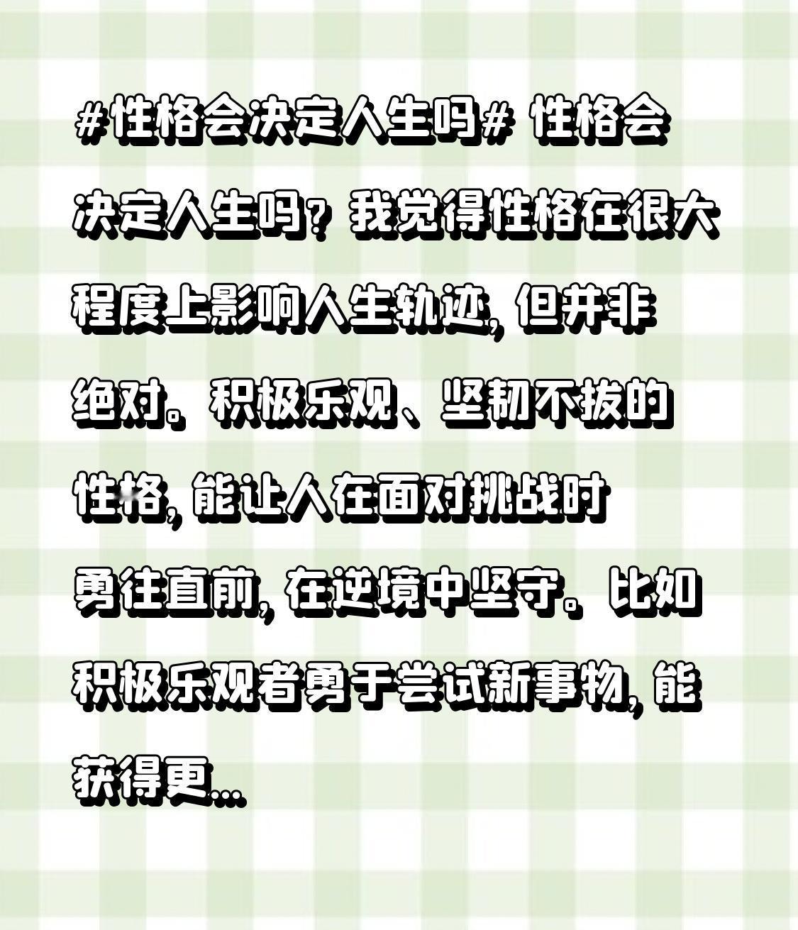 性格会决定人生吗?我觉得性格在很大程度上影响人生轨迹,但并非绝对。 积极乐观、坚韧不拔的性格,能让人在面对挑战时勇往直前,在逆境中坚守。比如积极乐观者勇于尝试新事物,能获得更多机会;坚韧者不轻易放弃,最终实现目标。而且善于沟通、富有同情心的人,人际关系更好,对事业和生活都有益。 但性格有缺陷也不意味着就没救了。我知道一个社恐程序员主播,通过在地铁口直播写代码,把“害怕人群”转化为“人群需要被科普”,粉丝破十万、广告接到手软。所以,性格是初始装备,我们可以把短板改成长板,通过努力和自我调整,实现成长和改变。