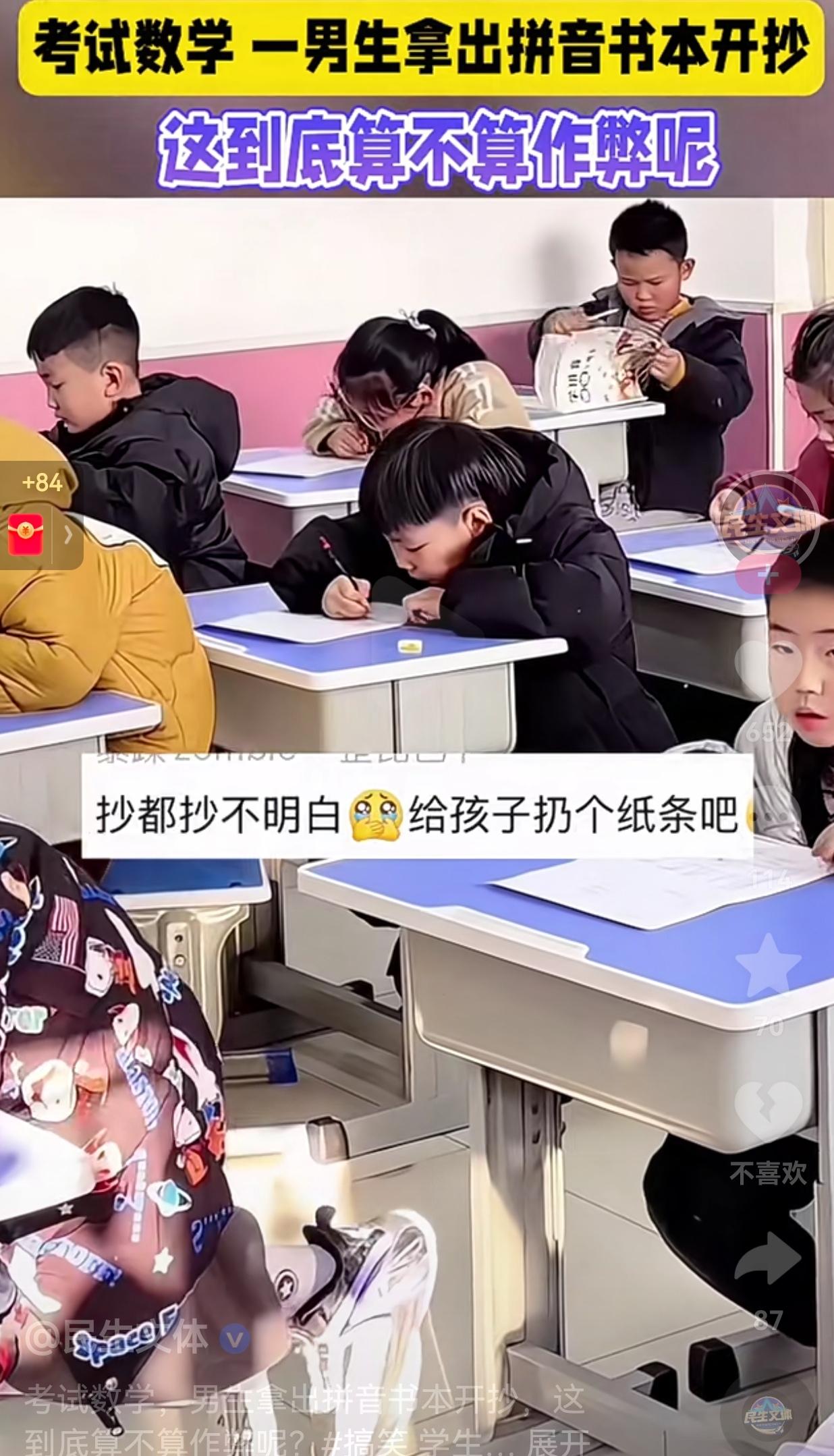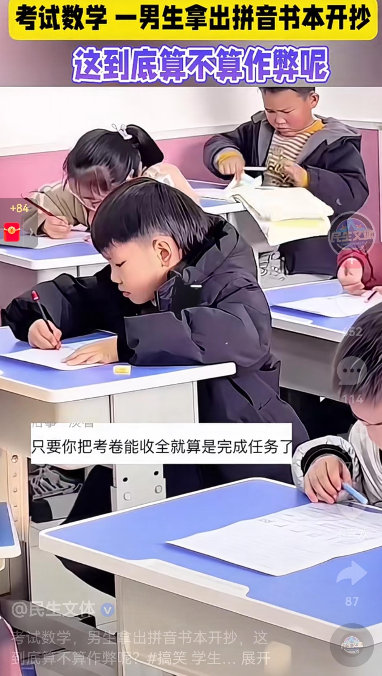 笑不活了!数学考场里,一个小男孩居然掏出拼音书埋头苦抄,那认真的样子,让网友们忍不住调侃:“这到底算不算作弊啊?” 视频中,其他的孩子都在低头认认真真的答题,只有一个男孩,从书包里拿出一本拼音书,打开之后就盯着书本一顿猛抄,手指在书页上划来划去,仿佛在找心中的答案。 可是明眼人都知道,拼音书里哪能有数学题的解法?这不是驴唇不对马嘴吗? 网友看到后评论说:“书都翻烂了,硬是没翻到一个正确答案。” 也有的网友说:“老师,你是不是应该去提醒一下他拿错书了。” 更有人打趣:“抄都抄不明白,给孩子扔个纸条吧。” 看到这一幕,给我整笑了,这孩子的脑回路也太神奇了吧,这孩子肯定不认识什么字?不然怎么可能找错书呢? 但是,反过来想想,这看似搞笑的一幕,其实也戳中了很多人心里的童年记忆。 小时候的我们,可能也有这种尴尬又笨拙的举动吧! 或许对这个小男孩来说,这次抄错书的经历,会成为他童年里一个有趣的小插曲。 而对我们来说,也该学着用孩子的视角看理解问题,多一份包容和理解,毕竟谁的童年,还没干过几件傻事呢?