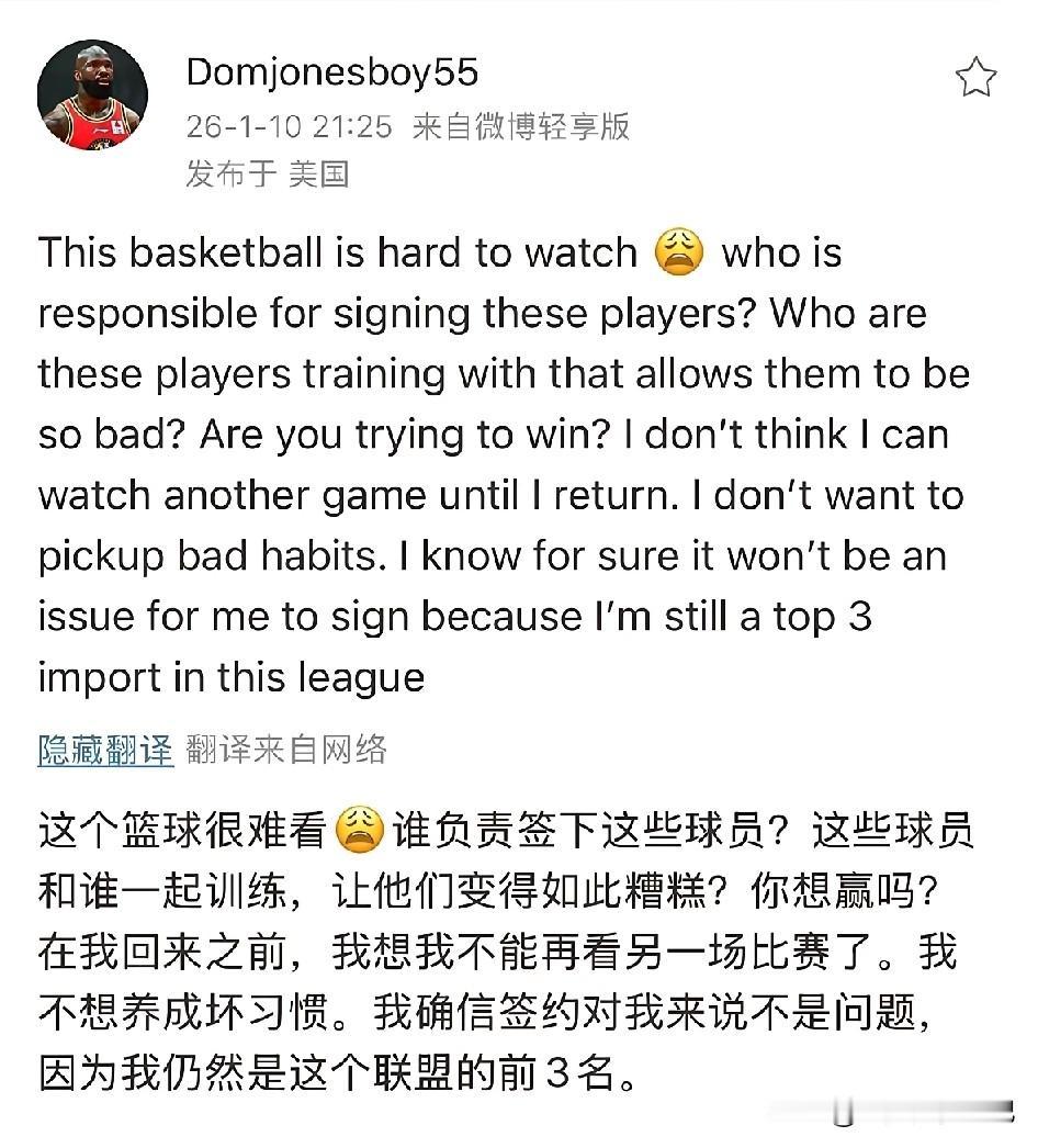 琼斯去向已经浮出水面,就是北控或者新疆! 最近关于琼斯的去向一直是球迷们关注的话题,各种猜测从出不穷,但随着琼斯最新的发文,去向已基本锁定,那就是新疆或者北控。北控的概率更大。 琼斯突然发文,暗嘲某支球队打的太差。自己回去以后不想跟他们一样。大家都知道,琼斯曾经在新疆打过球,最近新疆又打的太差,琼斯对老东家不满也很正常。 但新疆用过琼斯,以新疆俱乐部的特点是不会再签约琼斯的,那么矛头就指向了另一支球队那就是北控。恰巧琼斯发文之前北控20分惨败。这不能只是巧合。尽管后来琼斯删掉了,但球迷们也因此断定,琼斯的下家就是北控。大家对此怎么看!