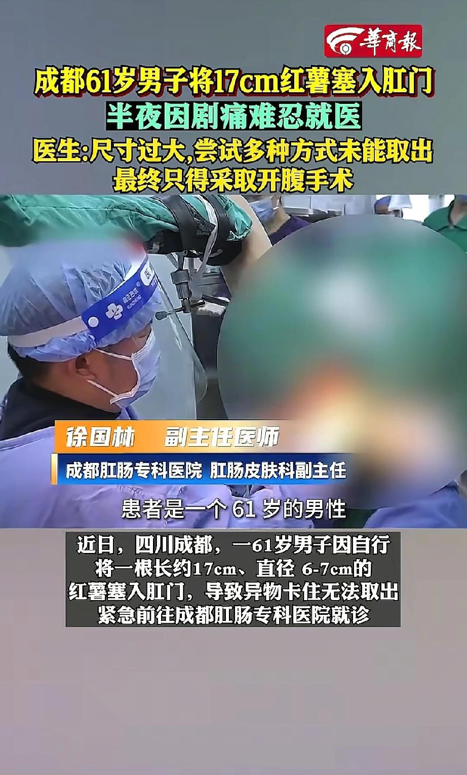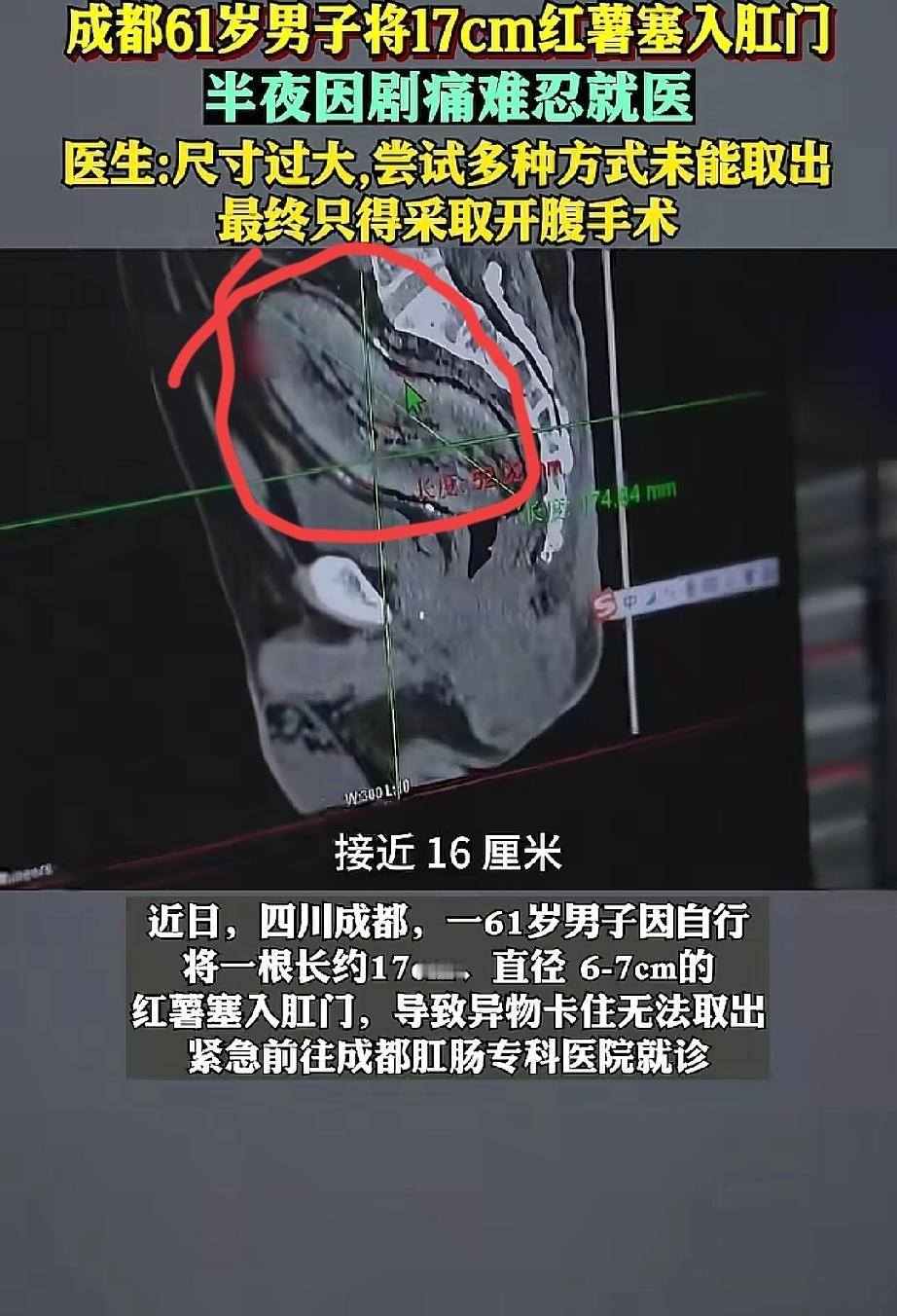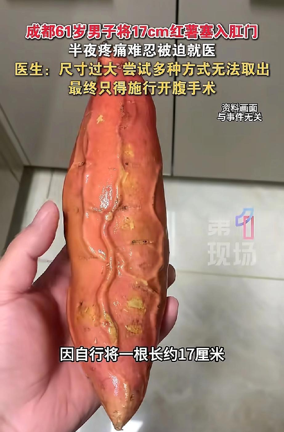 四川成都,61岁的大爷深夜无聊,竟然找来一根17cm的红薯塞入肛门,不过几个小时后,身体疼痛难忍,只能去医院找医生救助,就连医生都没见过这么夸张的问题,最后只能做手术取出 据医生介绍大爷在半夜11点,闲来无事拿起家里一根红薯,这红薯长约17厘米,粗细和普通水杯差不多。他没多想,就把红薯往自己肛门里塞了进去。 到了凌晨4点,大爷被一阵剧烈的疼痛惊醒,他试图自己把红薯弄出来,但红薯已经完全卡住,根本动弹不得。 没办法,他只能赶紧跑到医院求助。医生先是尝试把红薯搅碎,可红薯质地太硬,这方法行不通;又找来红酒开瓶器,想固定红薯把它拽出来,结果还是失败了。 折腾了好一阵,医生只能和大爷沟通,最终通过开腹手术,才把这根惹事的红薯取出来,大爷这才脱离了危险。 有网友调侃说:“可以去蒸个桑拿,等红薯熟了软了就出来了。” 但这可不是闹着玩的!想想大爷又疼又尴尬的处境,真的让人又急又气! 身体非常精密,但也十分脆弱。肠道黏膜娇嫩,强行塞入巨大异物极易导致黏膜损伤、出血、穿孔,甚至引发致命的腹膜炎。 一时的“猎奇”或“冲动”,代价可能是承受巨大的痛苦、面临昂贵的手术,以及留下终身的身心创伤。 身体又不是试验场,怎么能随便往里面塞东西呢?这种对身体结构和风险的无知,真的太不应该了! 而且很多人遇到这种事,会因为觉得羞耻就拖着不去医院,殊不知越拖越危险。 医生的职责是救命治人,在专业医生面前,任何病症都没有“羞于启齿”这一说。第一时间求助,才是对自己生命最大的负责。