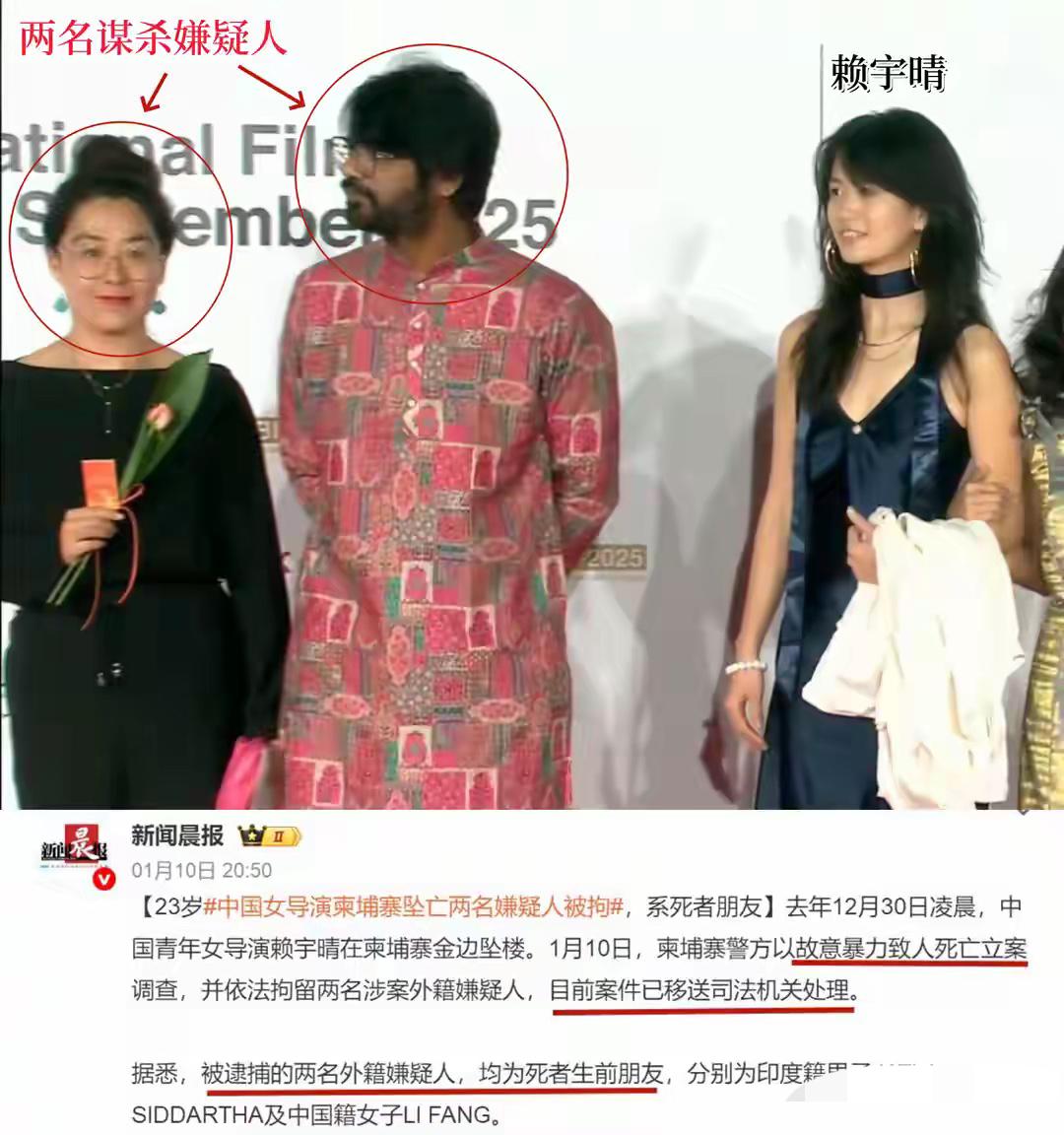 搞死中国女导演赖宇晴的凶手身份曝光,一个是中国女子李芳,43岁,是一个制片人,另个一个是印度人贾特,41岁,也是搞影视方面的,在印度小有名气。从之前的合影看,在柬埔寨拍片子他们应该是合作愉快,几个人勾肩搭背的,显得特别亲昵。但是12月30日凌晨的事情,却发生的很蹊跷,就是2楼,三人在阳台交谈,发生争执,具体是什么原因不清楚,照说这么一点高度摔下去,人顶多摔伤而已,不会致死。目前二人已经被以暴力致人死亡罪逮捕。李芳前夫