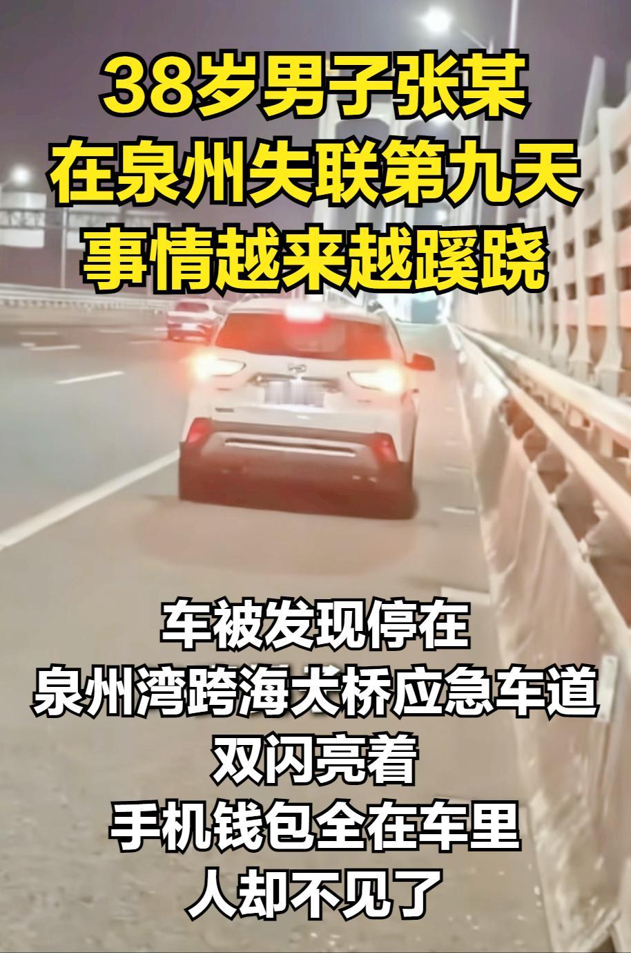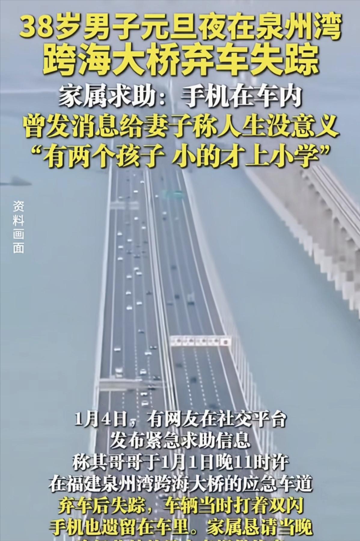 38岁男子张某在泉州失联第九天,事情越来越蹊跷,弟弟发声质疑嫂子说法。 元旦晚上11点40分,张某给妻子发了条人生没有意义的微信后失联。第二天下午,他的车被发现停在泉州湾跨海大桥应急车道,双闪亮着,手机钱包全在车里,人却不见了。 从河南赶来的弟弟觉得这事没这么简单。哥哥在石狮打工20年,不赌不嫖,手有存款正准备全款买房,家里两个孩子都在老家读书。这样一个人,怎么可能因为洗不洗脚这种拌嘴就轻生? 弟弟指出了几个疑点,家里大钱都在嫂子手上;翻遍家人手机,竟找不到哥哥近期生活照;而嫂子在收到那条绝望微信后,是隔了一整夜才报的警。 更耐人寻味的是,网上流出一张某失联前疑似发给妻子亲戚的聊天记录,内容像是在托付后事。 家属们已把能找的地方都找了,甚至花高价请无人机搜索海域,但一无所获。桥段监控太远,夜间画面模糊,车上又无行车记录仪。 两个孩子还在河南老家等着爸爸回家过年,高考在即的大儿子尚不知情。一个中年男人的突然消失,留下的疑问远比答案多。