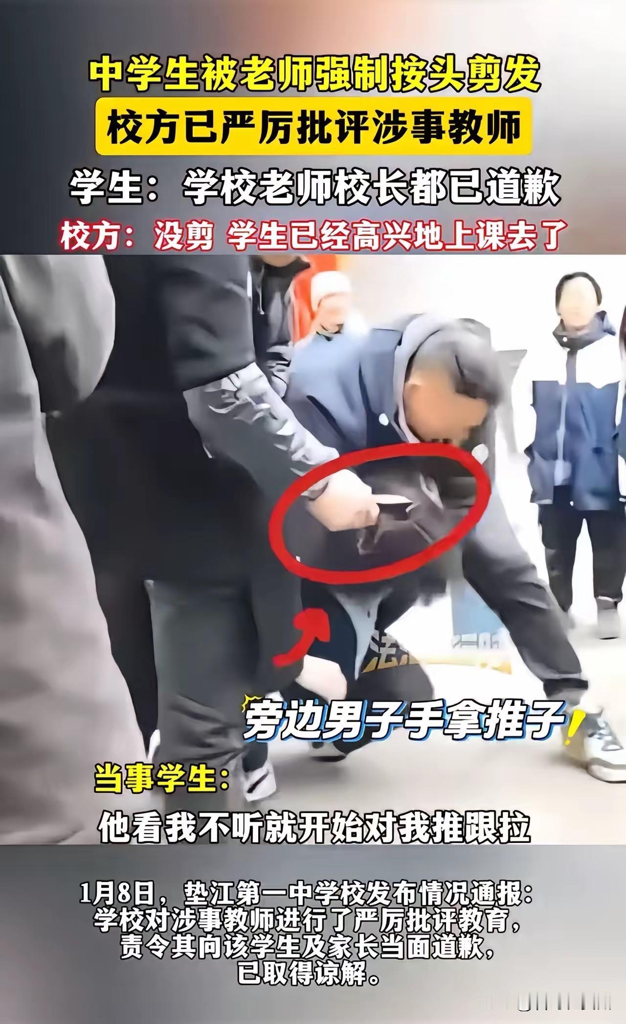 男生拒剪3厘米短发,被老师按头强剪!全网怒骂时,我偏要替老师说句狠话! 就为了一缕头发,一名中学生被四五个老师按在走廊地砖上,推子“嗡嗡”响着就往头上怼!孩子挣扎尖叫,视频却火遍全网。学校光速道歉,可你猜怎么着?网友反而彻底吵崩了! 规矩碰上“我就不” 这事儿起因特简单——学校明摆着规定:男生头发不能过3厘米。可这男孩就觉得长发帅气,整改通知?压根没放心上。结果那天放学,老师直接在教学楼“蹲”到了他。 冰冷的推子,滚烫的争议 老师一句“现在必须剪”,孩子扭头想跑。几个老师一围,直接把人按倒在地。孩子嘶喊着、踢打着,推子却已贴上头皮。视频里,头发一撮撮掉在冰冷地砖上,像极了某种尊严被当众剥落。 全网炸出两个极端 视频一出,骂声排山倒海:“这是教育还是羞辱?”“按头剪发,跟驯兽有啥区别?”可另一边,声援老师的声音也毫不示弱:“规矩就是规矩!今天管不住头发,明天就管不住人生!”“家长舍不得管,老师不敢管,将来社会替你管!” 今天,我替老师扛一次骂 在一片骂声中,我想说句扎心实话:我们是不是把“尊重个性”演成了“放纵任性”?学校从来不是自由市场,它是孩子接触的第一座“社会训练场”。纪律,本就是最基础的那堂课。 推子剪掉的,真是尊严吗? 我们都盼着教育温柔,但有时教育必须带点刺。那把推子剪掉的,或许不是尊严,而是一种“我可以例外”的傲慢。现实社会不会永远给你商量余地——红灯就是不能闯,准则就是不能越。今天老师松一厘米,明天孩子就敢踩一条线。 教育的难,从来不是管不管,而是怎么在“立规矩”和“给尊严”之间,找到那条细细的线。但若非要二选一——宁可孩子今天恨我严,不愿他明天恨我纵。 你说,老师这一推子,到底推错了还是推醒了?评论区,我等你吵明白。剪头好丑 剪头的小男孩 剪头发的男孩子 初中生剪头 初中生理发 高中强制理发