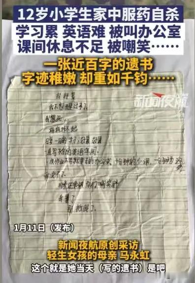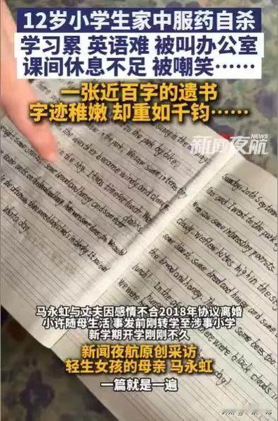 江苏,12岁女孩,因为不会写英语单词,被老师叫到办公室,她回家之后,看着那些英语作业,她觉得累了,不想活了,就吞下100粒药,结束了自己的生命,事后女孩母亲起诉英语老师和学校。 “如果没有英语作业,我的女儿是不是还活着?”马女士不停地问自己,她非常后悔给女儿转了学,如果不给女儿转学,女儿不遇到那个英语老师,女儿也就不会因为英语作业而离世。 马女士和前夫离了婚之后,她就发誓,她的时间要好好陪伴女儿,在大城市立足,给女儿争取更多的学习资源,陪女儿把学习学好。 为此,她给女儿转到了一所不错的学校,可就是这个决定,让她的女儿走上了不归路。 自从转到新的学校,马女士就没有接到过学校的电话,老师也没有打电话给她,开学10多天过去,她没有接到老师的电话,她也就认为孩子在学校,融入了新的学习环境。 本来她的女儿就很活泼开朗,经常和陌生人有自来熟的感觉,她也很相信女儿,能够在新的学校,很快交到朋友。 孩子那么开朗,老师又没有打电话给她, 马女士对女儿很放心。 正好那段时间,马女士的母亲心脏有问题,那天她正好陪母亲在医院,她还担心在家的女儿,是否有在好好学习。 结果那天晚上,她和女儿就阴阳相隔了。 女儿给她留下一份遗书,遗书上说,她太累了,她不想醒过来了,日复一日的学习,让她很烦躁,还有那些不会写的英语单词,一次不写就会被老师叫进办公室沟通和辅导,回来之后还要被同学们嘲笑胖,这样的学习,这样的学习环境,她累了,她让亲人不要救她。 看到女儿留给她的遗书,马女士这才意识到,平时活泼开朗的女儿,原来有这么大的精神压力。 她看着女儿床上的那一堆英语作业,感到非常的心痛。 女儿才12岁,她一把屎一把尿地把女儿拉扯长大,她精心培育了女儿12年,她无微不至地照顾了女儿12年,却因为英语作业,让她失去了女儿。 她看着那些英语作业,再也无法平静内心的愤怒,如果没有这些英语作业,她的女儿或许还活着。 为什么马女士对英语作业会有这么大的情绪? 原来,马女士的女儿转学之后,遇到的英语老师,或许比较严格,一次不写作业,就会被叫到办公室沟通或者辅导。 她的女儿就是因为不会写英语单词,被老师叫进了办公室,她无法承受这样的压力,更无法承受,来到新的学习环境,同学们会嘲笑她胖。 胖不是她所能控制的,学习也不是她能随心所欲的,这样一日复一日的学习,早就让她疲惫不堪。 她这才留下遗书,将外婆治心脏的药,一次吞下100粒,她迷上了双眼,结束了自己的生命。 女儿离世后,马女士时常会心情烦躁,她会来到女儿的坟前,静静地陪着女儿,女儿在哪,她的家就在哪。 女儿是因为英语作业离世的,这与英语老师的教育息息相关,如果英语老师没有逼得这么紧,她的女儿或许就不会离世。 自从女儿离世之后,陪伴女儿的两只小狗小猫也跟着离世了,她梦到女儿在梦中变成黄色的蝴蝶来找她,女儿梦中喊道:“要替我讨回公道。” 梦中的女儿,没有了往日的活泼开朗,多了一份不甘,马女士决定为女儿讨回公道。 她起诉了英语老师和学校,因为他们没有履行自己的职责,才导致学生轻生离世。 那么马女士的女儿做出这样的举动,老师和学校是否需要承担责任? 首先,这就要确定英语老师布置作业是否合理?如果英语老师布置作业确实不合理,并且过于严格要求学生,导致学生产生轻生的心里,那么老师有过错。 《民法典》第1165条规定:行为人因过错侵害他人民事权益造成损害的,应当承担侵权责任。 只有老师有过错,老师才需要承担责任。 其次,英语老师觉得自己很委屈,他说自己才任课十几天,和马女士的女儿才接触十几天,马女士的女儿就因为英语作业轻生,他不知如何自证。  《民事诉讼法》第64条第1款规定:当事人对自己提出的主张,有责任提供证据。 如果英语老师无法证明自己的教育行为,和马女士的女儿的离世没有因果关系,那么老师可能就要承担责任。 不过一审法院经过审理认为,马女士的女儿离世和英语老师的教育并没有因果关系,因此驳回了马女士的诉讼请求,马女士不服,提起了上诉。 那么你觉得英语老师有责任吗?