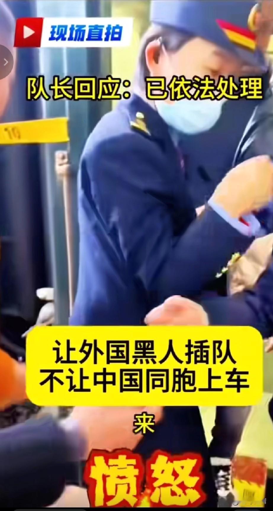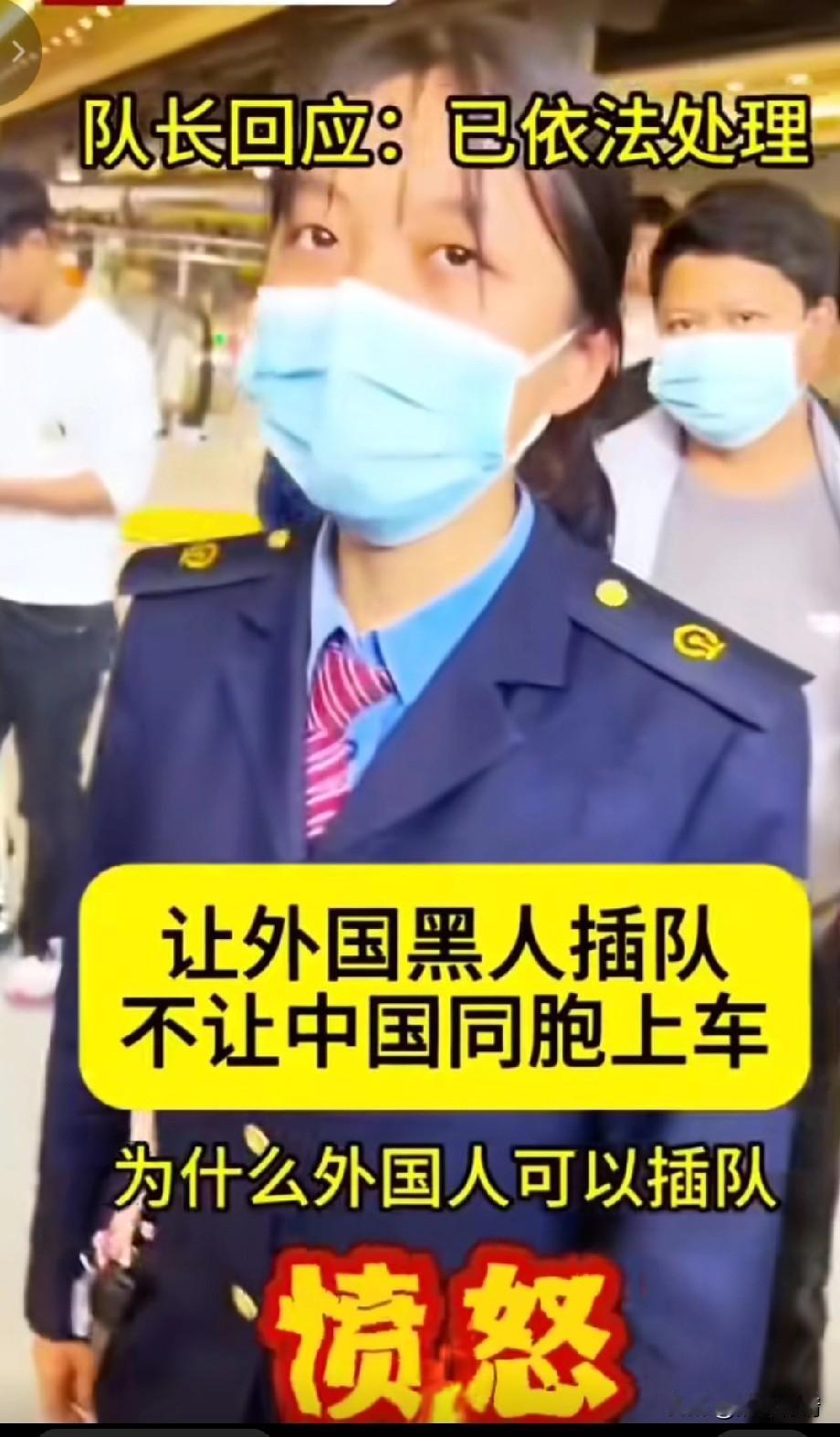 广州白云站吵起来了,一名老外强行插队,无视检票直接进入列车内,旁边排队检票的小伙看不下去了!直接指责女站务员插队看不见吗? 1月3号广州白云站,人来人往,和往常一样乘客们都按照要求排队上车, 女乘务员正在挨个检票,突然一名老外走了过来! 看了一眼排的长队,直接强行插队,站在了队伍的最前方,然后直接就进入了列车内部,女乘务员没有丝毫阻拦,只是看了一眼! 这一幕引起了现场排队的小伙不满,小伙当场叫了一下检票的乘务员,并且喊道这老外插队你不管吗?女乘务员瞪了小伙一眼,不想理小伙,直接无视小伙的提醒! 仿佛就像没听到一样,继续检票,这下小伙不干了,明明在中国的土地上,还要被歧视对待,就拿出手机进行拍摄,并当场质问这位女乘务员,老外插队为什么不制止?没有检票机进入车厢符合规定吗? 女乘务员看着小伙的手机,对小伙怒目而视,但是没有开口说话,排队的人群也在议论纷纷,大家都纷纷指责这位女乘务员,旁边的站务长看见了这一幕,立刻走了过来, 那时候女乘务员才开口说话,她对站务长说拍着呢!站务长看了一下小伙的手机,二话没说直接进入车厢,将老外直接拽了出来, 老外也非常生气,出车厢的那一刻,表情充满了不屑,对着小伙瞪了过来,似乎就想动手打小伙,态度非常嚣张,这一幕被清清楚楚的拍了下来! 站务长让老外重新排队,这老外应该是在中国生活很久了,总想享受特权,他对于排队明明知道,但是他就不想排队,想凭借自己的身份搞特殊!可能平时享受惯了,上车的时候也不想排队检票! 女站务员可能觉得他是老外,也不想惹麻烦,所以就无视了老外插队上车,默许了老外不检票的行为!没有想到会有较真的小伙出手,这是女站务员和老外没有想到的,居然会有人站出来指责他们! 该事件在网络曝光后,引起了轩然大波,大家纷纷指责这位女站务员,对于老外的行为居然不制止,因为她没有履行乘务员的责任。 这名老外也被大家纷纷指责,这是把特权写在了脸上,根本不尊重中国的社会秩序! 舆论发酵之后,这位女乘务员受到了领导的批评,老外也被依法处理了,具体的情况不便告诉公众!这名当众指责老外的男乘客是好样的! 既然在中国生活,即使是老外也应该遵守中国的社会秩序,不能搞特殊化,列车工作人员更应该坚守底线,按照既定规则履行职责,规则面前人人平等! 大家对于广州白云站女乘务员默许老外插队不检票上车这事怎么看?欢迎评论区讨论!