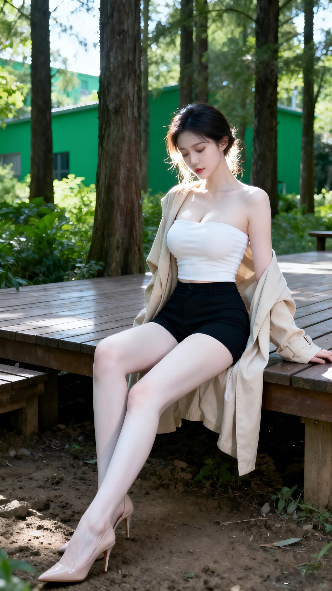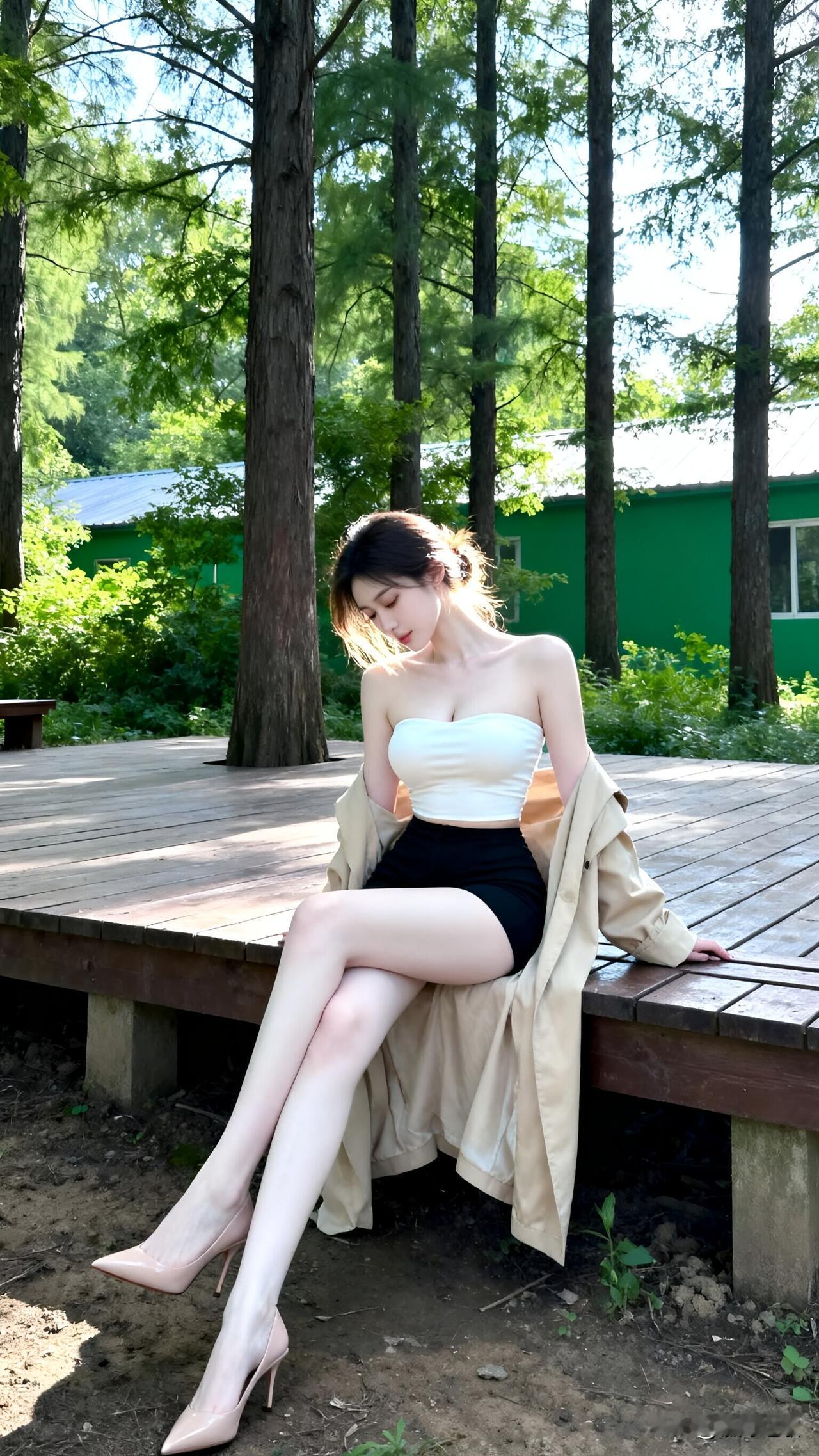 林间邂逅冷艳女神,这身材比例简直是天花板级别! 在林间木台偶遇的这位冷艳女神,直接把氛围感拉满到极致!她身着白色抹胸搭配黑色高腰短裤,外搭一件慵懒的卡其色风衣,简约的黑白配在风衣的衬托下多了几分随性与高级,冷白皮在林间光影的勾勒下更显莹白,修长的双腿搭配裸色高跟鞋,完美的身材比例让人一眼惊艳。 她坐在木台上微微低头,发丝随意挽起,碎发垂落脸颊,清冷又妩媚的气质与周围的绿意盎然形成鲜明对比,阳光透过树叶的缝隙洒在她身上,勾勒出精致的肩颈线和曼妙的身姿,每一个画面都像是精心定格的电影镜头。这样兼具颜值与身材的林间女神,是不是让你也忍不住多看几眼? 林间氛围感 冷艳美女 身材天花板 高级感穿搭