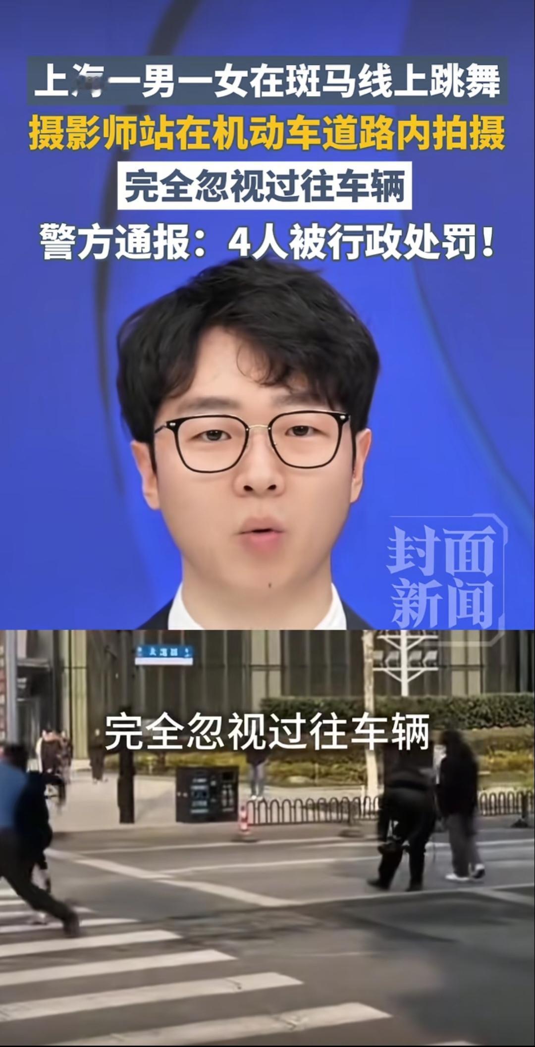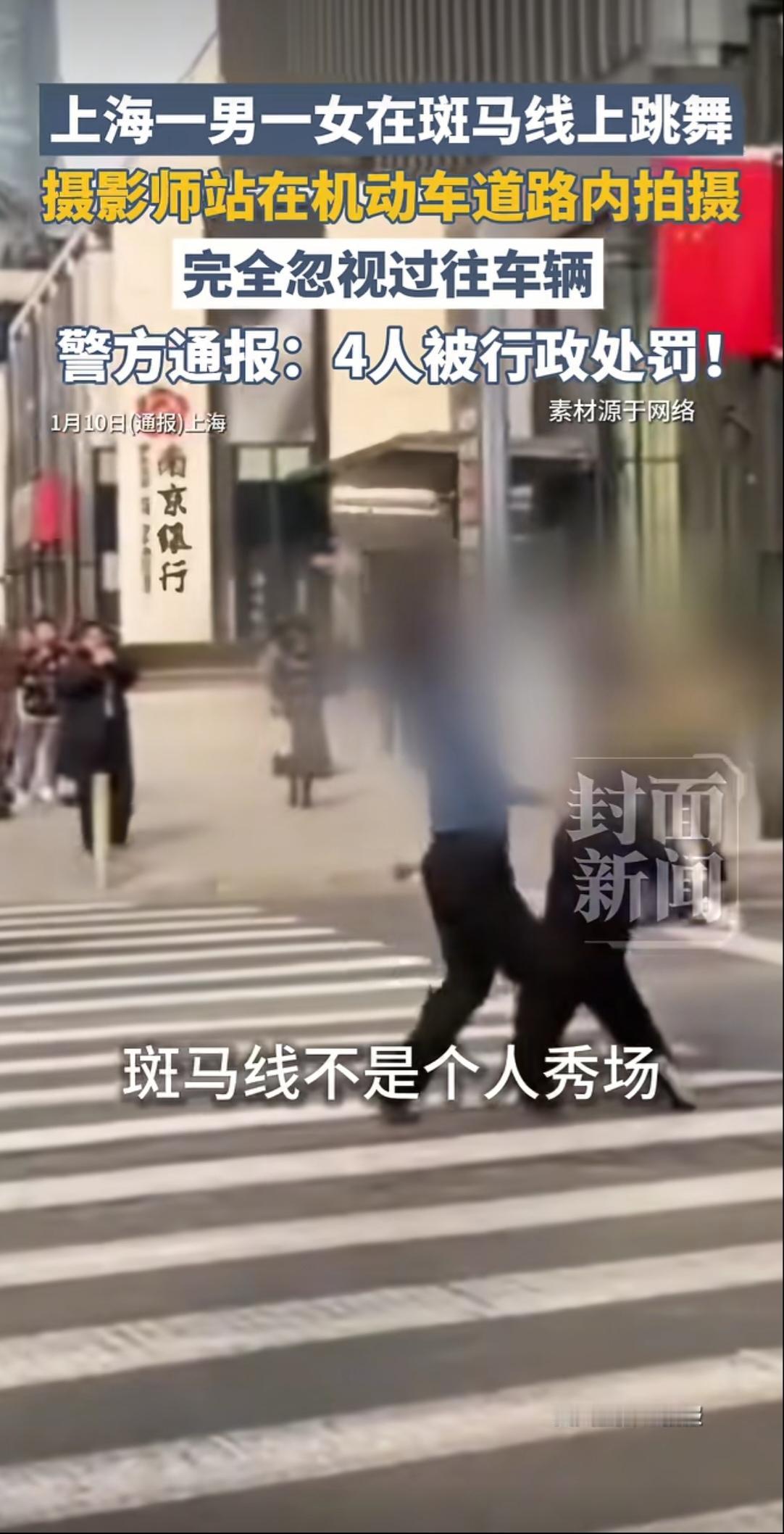太没有安全意识了!近日,有四人在上海一路口进行视频拍摄,其中一男一女在斑马线上跳舞,其他两名男子则在斑马线外进行拍摄,路口的车辆也正缓慢地从他们周围行驶,最终因严重影响交通秩序被行政处罚。网友:“这是连命都不要了?” 互联网的兴起,越来越多人加入到自媒体的行列中,通过流量来获得一份不错的收入,为了吸引流量,不少博主会想尽办法去博人眼球。但在斑马线上跳舞拍摄视频的行为就太不应该了,这不仅是对自己的生命不负责,更是过往车辆的不负责,这要是被撞上了算谁的责任? 斑马线是什么?斑马线是一条安全通道,并非是普通路面,它可以保障行人安全有序地横穿马路,这种在斑马线上跳舞拍摄的行为就是对公共安全的藐视。 视频被发出后,很快就有交警对他们的行为作出处罚,并提醒群众要遵守交通法规。有网友表示,为了流量真就连命都不要了?那怎么不去火车轨道上跳,更带劲! 信息来源:《上海一男一女在斑马线上跳舞,摄影师站在机动车道路内拍摄,警方通报:4人被行政处罚!》封面新闻